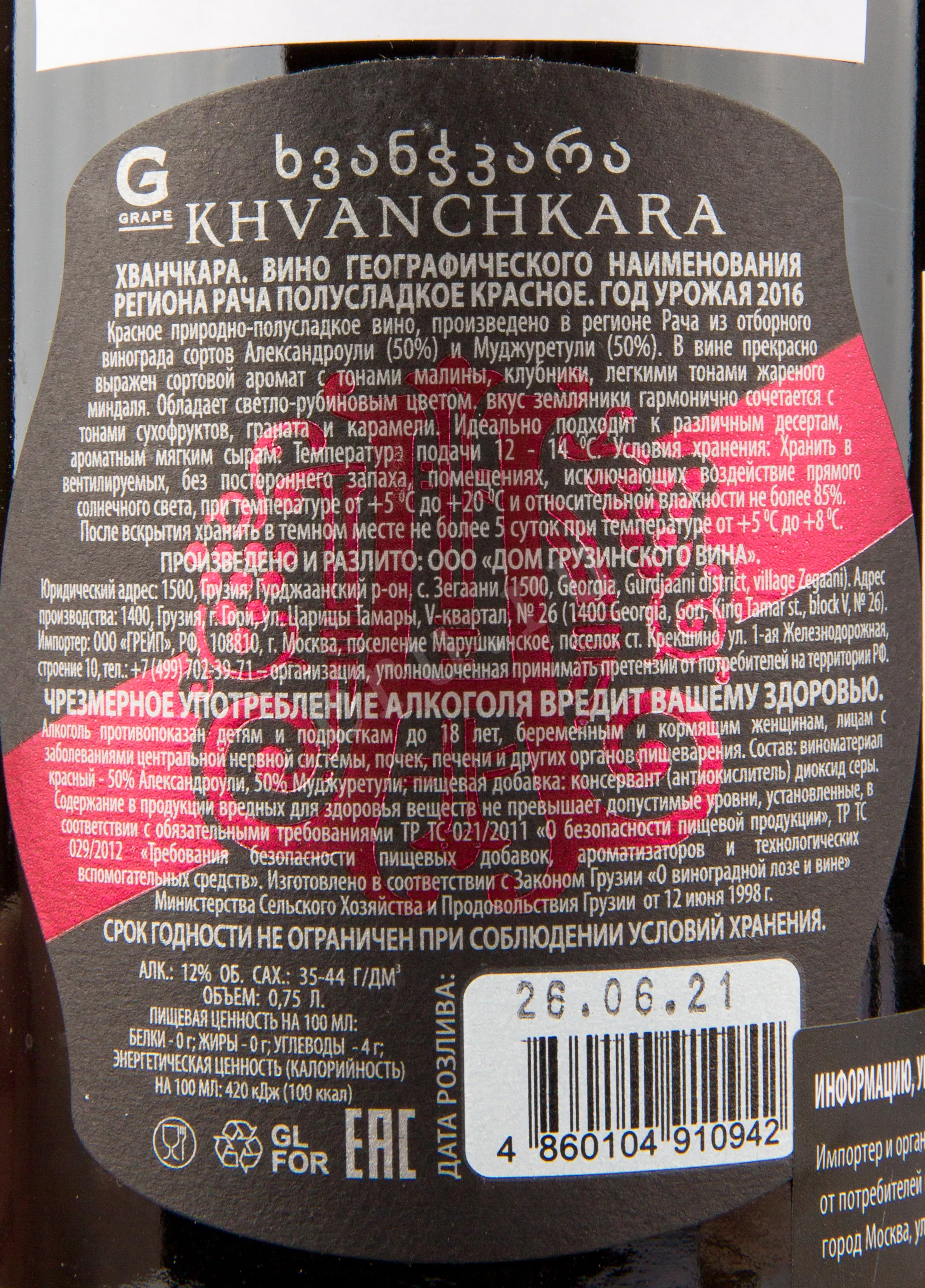 Красное полусладкое вино Alexandrov Wine Khvanchkara 2016 г. из линейки авторских напитков грузинского хозяйства произведено по аутентичным и европейским технологиям на базе равных пропорций двух сортов аборигенного винограда. Областью его сбора является микрозона Хванчкара в области Рача-Лечхуми. 12-градусный напиток без искусственных добавок обладает сахаристостью в пределах 44 г/л.