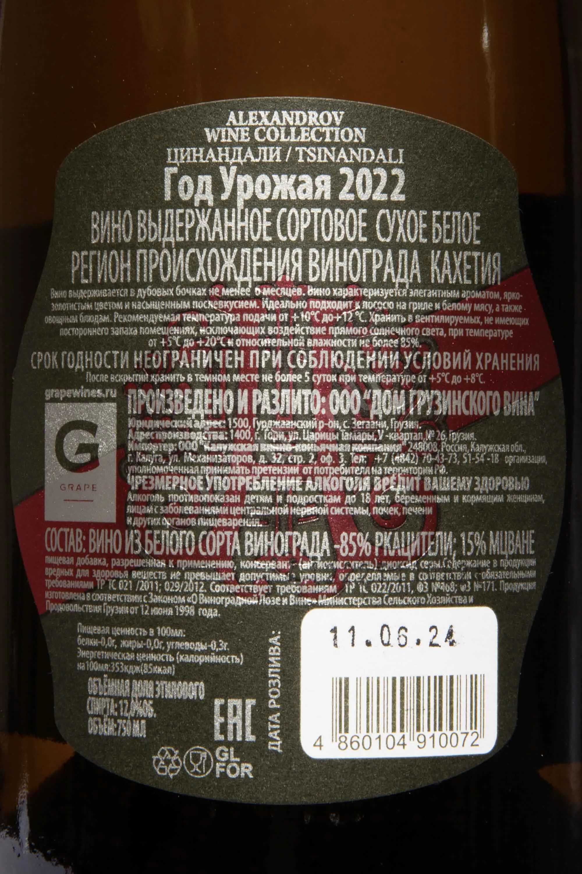 Белое сухое вино Alexandrov Wine Tsinandali 2017 г. — популярный напиток защищенного географического наименования, содержащий алкоголь в объеме 12%. Основой выступили тщательно отобранные ягоды аборигенного сорта винограда с угодий микрозоны Цинандали в Кахетии. Производство прошло по традиционному алгоритму, подразумевающему ферментацию охлажденного сырья в стальных цистернах при постоянно поддерживаемой температуре 15-18 °C и вызревание на осадке. Часть вина сбраживалась в дубовой таре.