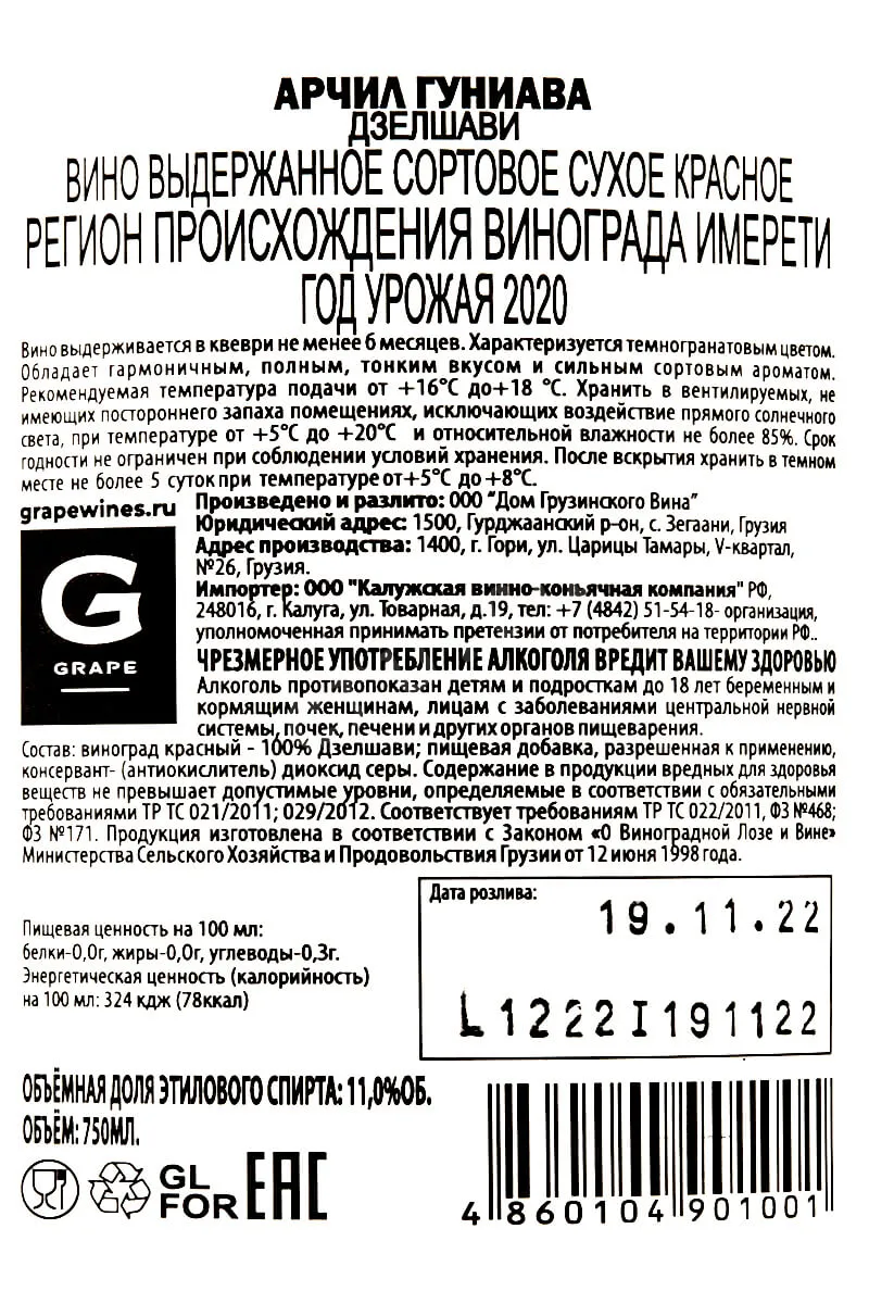 Вино Арчил Гуниава Дзелшави 0,75л — это благородный напиток, рождённый в сердце грузинской Имеретии, где древние винодельческие традиции соединяются с тонким искусством современного мастера. Производитель Арчил Гуниава создаёт красное сухое выдержанное спиртное из автохтонного сорта Дзелшави, следуя старинной технологии квеври — ферментации и выдержки вина в глиняных амфорах, зарытых в землю. Урожай собирается вручную в период позднего созревания, когда сахаристость ягод достигает 17–20 г/дм³, обеспечивая напитку природную полноту вкуса. Вино выдерживается не менее шести месяцев, что формирует его мягкую структуру и гармоничный баланс. Терруар Имеретии, с её известняковыми почвами, мягким влажным климатом и солнечными склонами, придаёт сорту Дзелшави характерную минеральность и изысканную глубину, делающую каждую бутылку отражением земли и ремесла.
