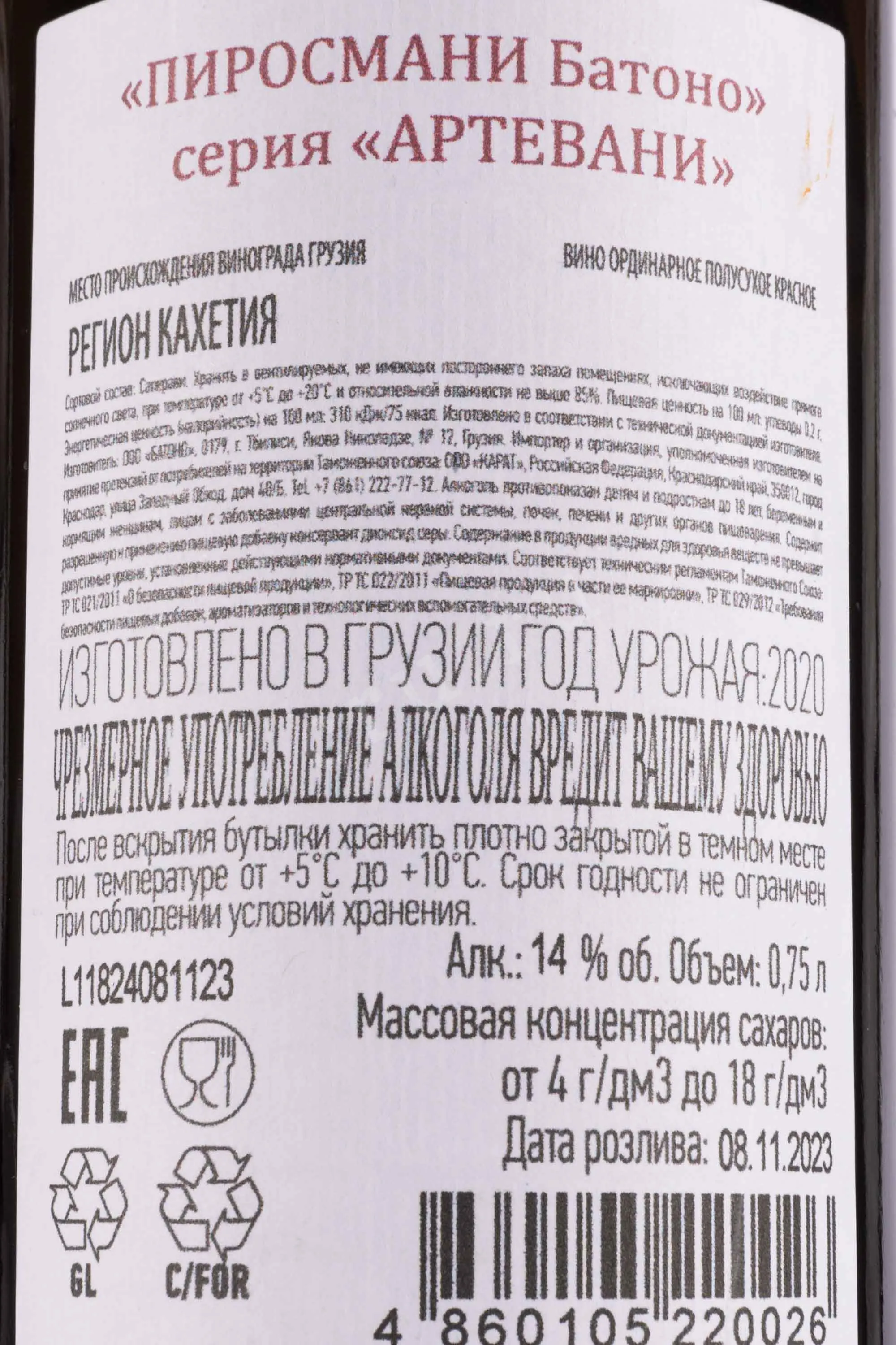 Вино Артевани Пиросмани Батоно 0,75 л — изысканный представитель грузинского виноделия региона Кахетия, созданный мастерами компании «ООО Батоно». Этот напиток воплощает традиции восточной части страны, где виноград выращивается на плодородных участках у села Энисели. Местный терруар, представленный мягким климатом и минеральными почвами, насыщенными известняком и глиной, придаёт ягодам особую силу и ароматическую глубину. Сырьём служит 100% автохтонный сорт Саперави, отличающийся высокой концентрацией природного сахара. Производство проходит в стальных резервуарах пищевого исполнения, с длительным выдерживанием на осадке и регулярным перемешиванием — именно этот процесс раскрывает многослойность вкуса и насыщенность цвета. В результате рождается напиток с гармоничным балансом кислотности и сладости, отражающий подлинный характер кахетинской земли.