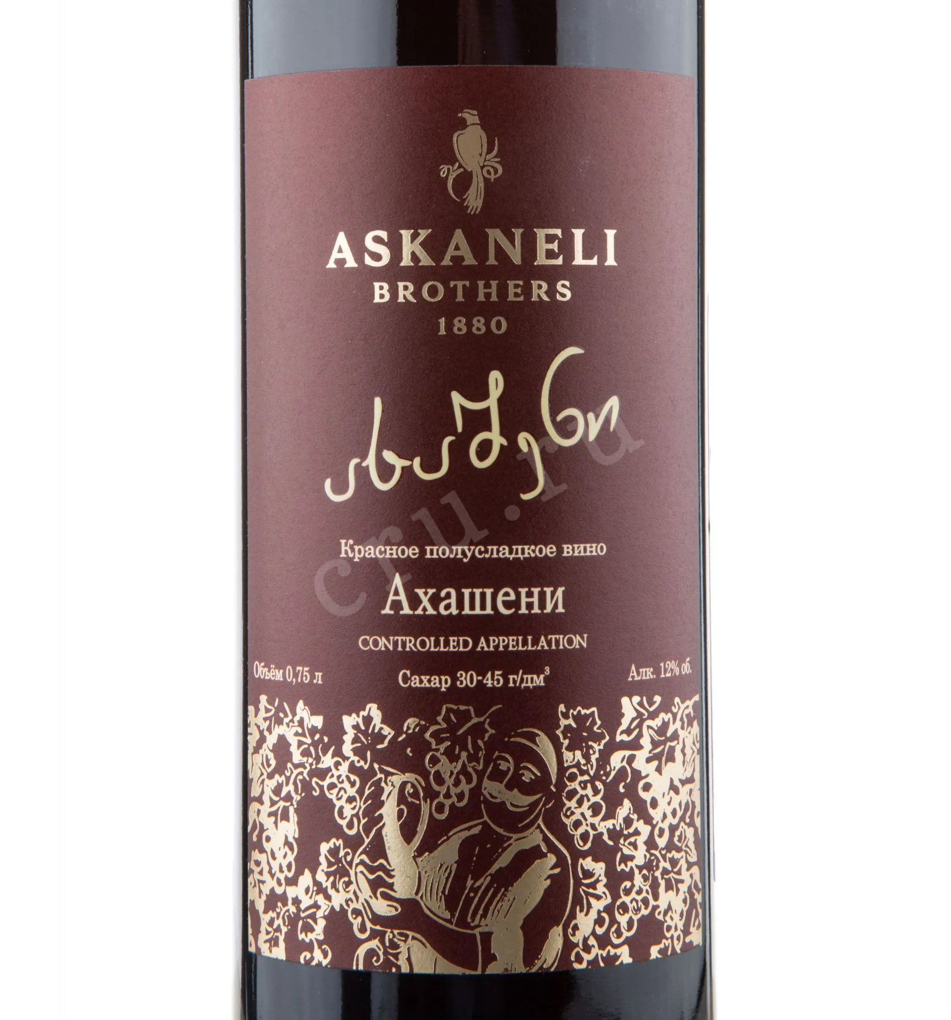 Красное полусладкое вино Askaneli Brothers Akhasheni 2019 г. является винтажным благодаря присутствию в составе виноградного сырья одного года урожая. В этом качестве выступил аборигенный сорт с угодий грузинской Кахетии, прошедший обработку по методу терморегулируемого сбраживания в баках из нержавеющей стали. Для сохранения требуемого содержания сахара процесс остановили принудительно посредством снижения температуры.