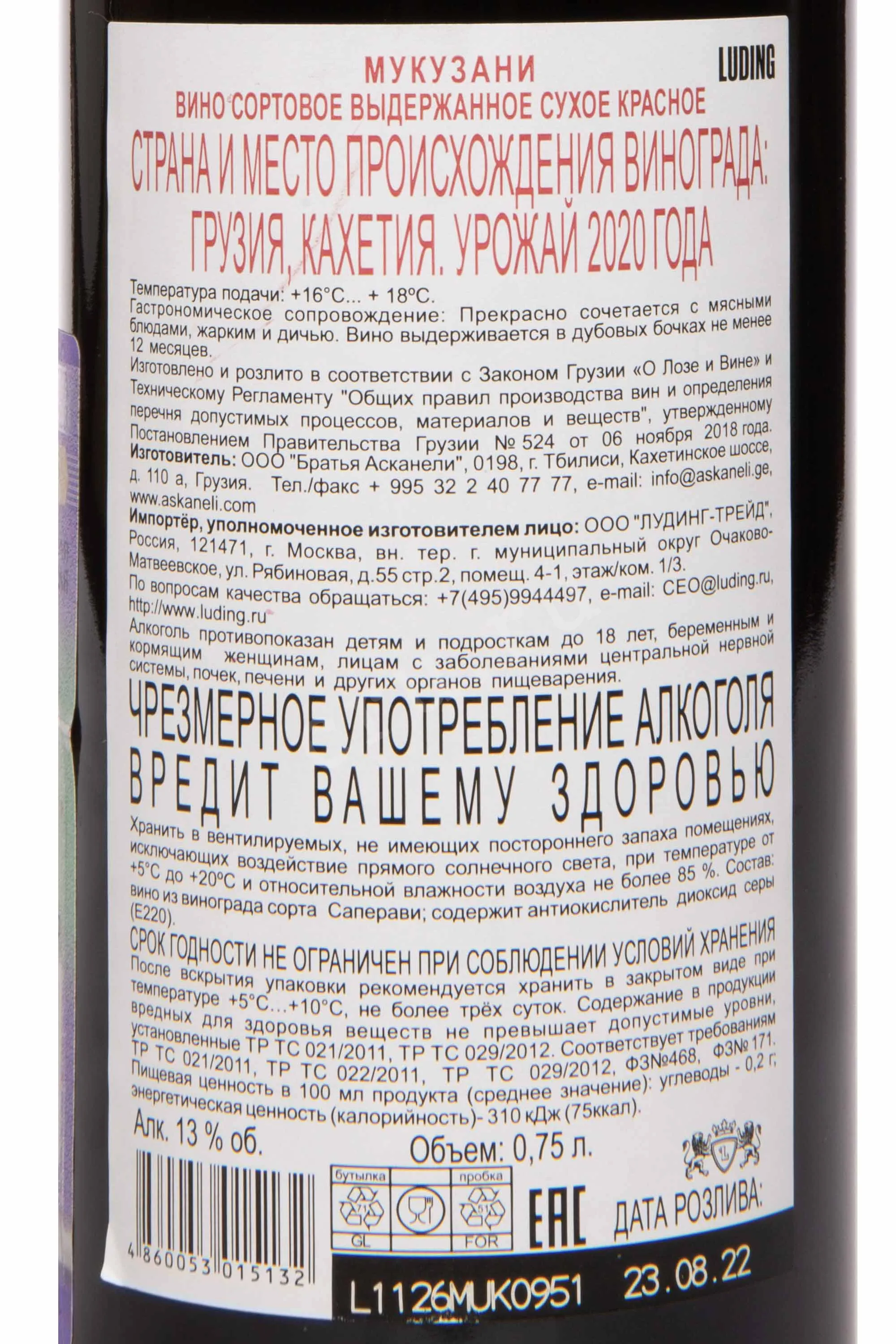 Вино Askaneli Brothers Mukuzani 2019 0.75 l – это разновидность известного грузинского алкоголя, созданная исключительно из одного сорта винограда урожая 2019 года. Гроздья были собраны ручным способом с лоз, произрастающих в микрорайоне Мукузани Гурджаанского района в Кахетии. После сортировки ягоды отправляют под пресс для получения сока. Затем напиток подвергают ферментации в стальных чанах при контролируемой температуре в течение 1-2-х недель. Перед бутилированием красное сухое вино вызревает не менее года в старых и новых дубовых барриках. Готовый напиток разливается при крепости 13% в сосуды из темного стекла объемом 750 мл.