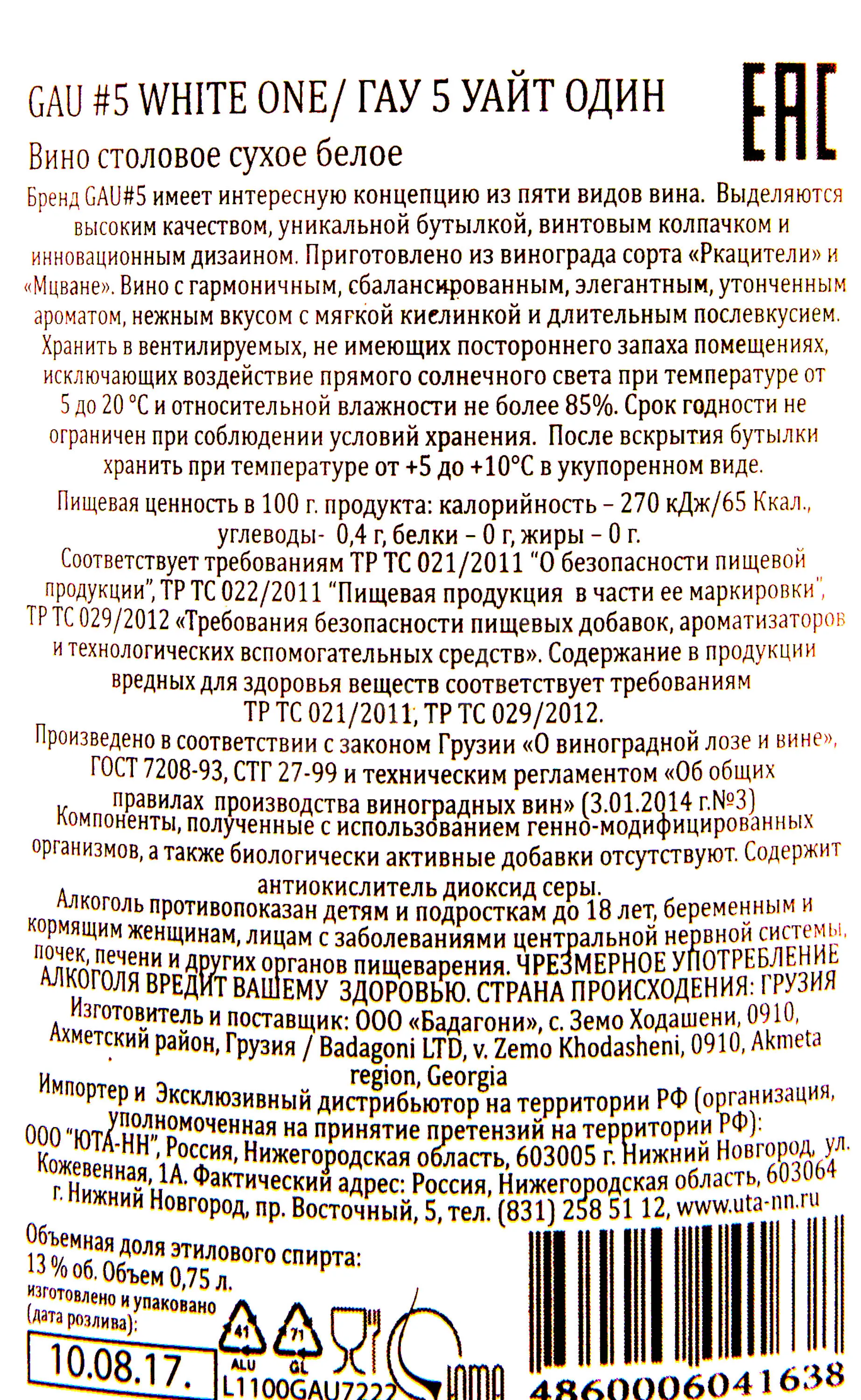 Вино белое сухое Badagoni Gau 5 White One 0,75 л – первая вариация из уникальной номерной линейки производителя. Созданная под контролем главного энолога Донато Ланати, коллекция из пяти образцов призвана раскрыть с новой стороны богатство грузинской винной классики. На производство напитка пошли ягоды двух популярных грузинских автохтонов. Плоды собрали на кахетинских виноградниках ранним утром и в тех же ящиках переправили на винодельню в течение нескольких часов. Там сырье прессовали, а отжатый сок сбраживали в специально спроектированных горизонтальных ферментерах. Разлили напиток в темные бутылки с минималистичной этикеткой в оригинальном стиле, едином для всей серии Гау#5.