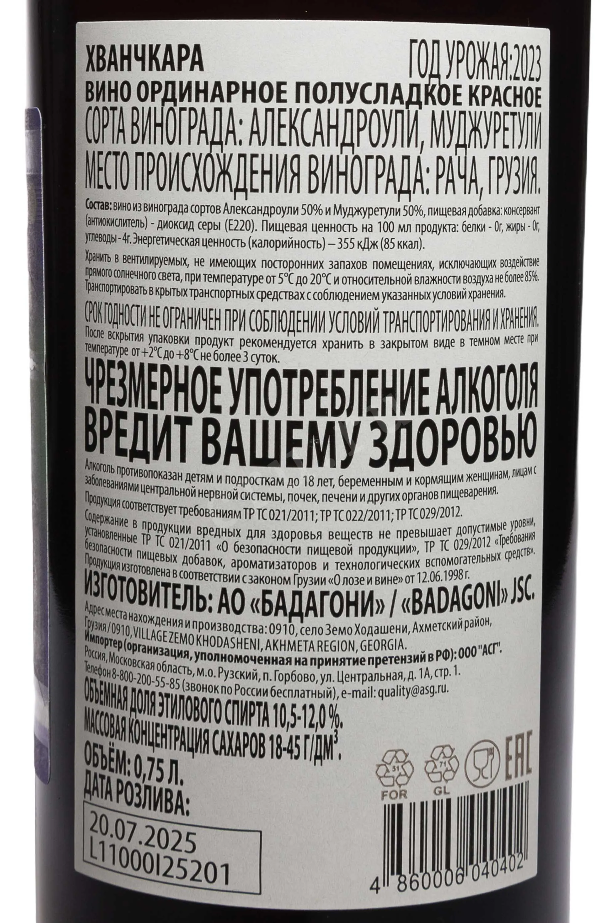 Вино красное полусладкое Badagoni Khvanchkara 0,75 л – сорт спиртного, которым по праву гордятся грузинские виноделы. Напиток имеет сладкий от природы вкус, который фиксируется благодаря преждевременному завершению процесса ферментации сусла путем охлаждения. Для винификации используется два автохтонных красных сорта винограда. Урожаи собирают только в одной микрозоне – в окрестностях села Хванчкара, расположенного в исторической области Рача. Строго определенное место происхождения сырья позволяет выпускать спиртное под наименованием с защищенным географическим указанием.