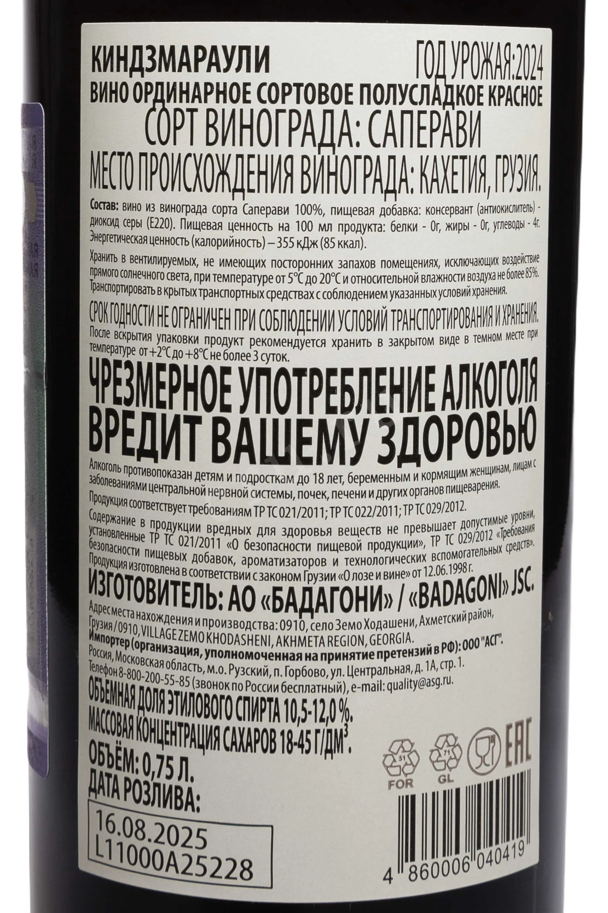 Вино красное полусладкое Badagoni Kindzmarauli 0,75 л – вариация в стиле знакового для грузинского виноделия сорта спиртного. Она производится из ягод местного винограда, собранного строго в специфической зоне Киндзмараули, что в Кварельском районе Кахетинской области. Урожай созревает на склонах Кавказских гор, где жаркое солнце встречается с прохладным воздухом, создавая идеальные условия для медленного созревания плодов. На начальной стадии переработки сырье имеет сахаристость не менее 22%, поэтому, когда процесс брожения останавливают охлаждением, сусло остается еще достаточно сладким.