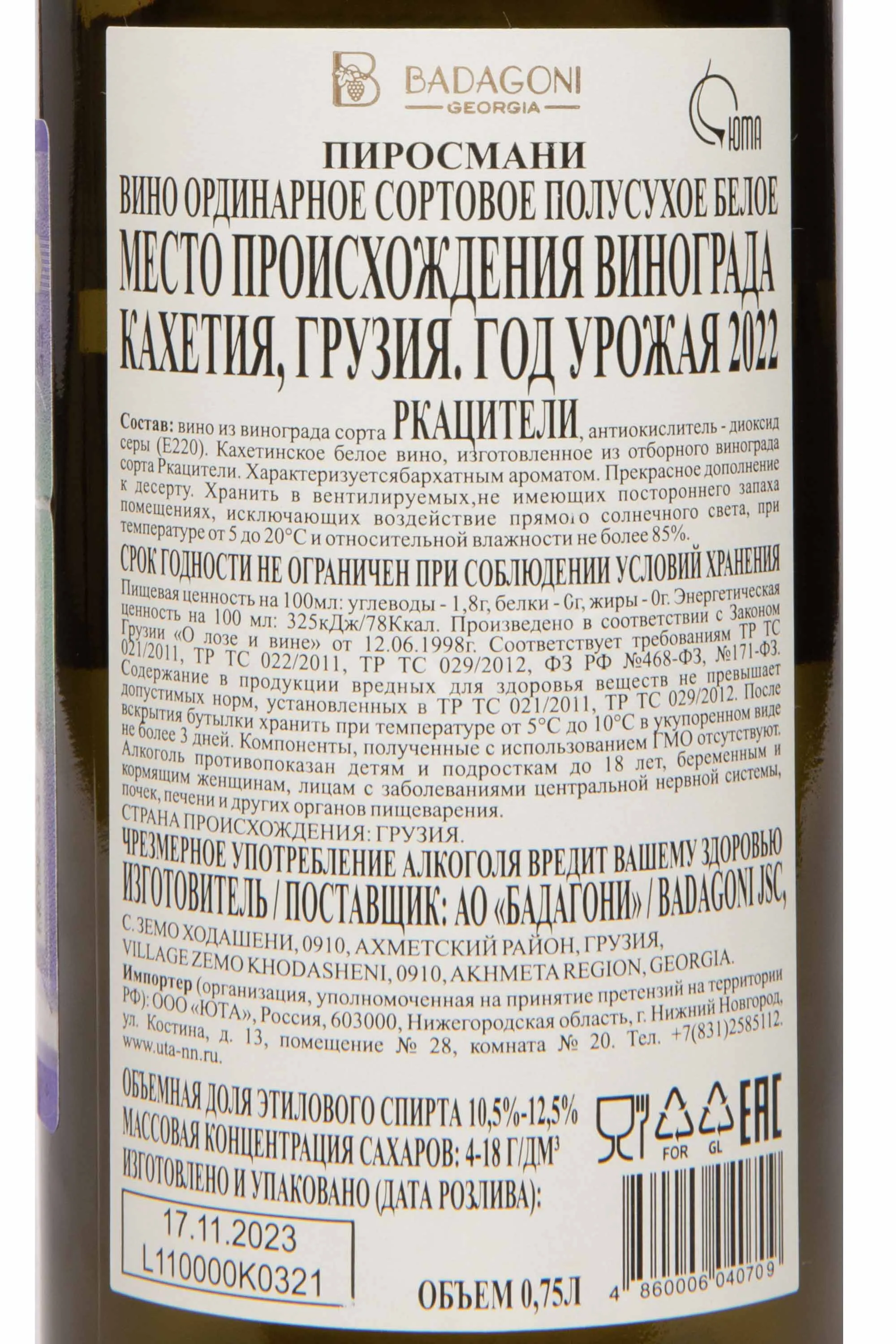 Вино белое полусухое Badagoni Pirosmani white 0,75 л – один из ценных образцов коллекции известного грузинского производителя. Виноград для производства напитка выращивают в Алазанской долине – в окрестностях села Карданахи области Кахетия. Богатой органолептики производитель добивается применением рача-лечхумской технологии. Согласно ее стандартам, сусло сбраживается не до конца – процесс прерывается методом охлаждения. Из-за этого в спиртном остаются природные сахара, обеспечивающие дивный вкус и выразительную текстуру.