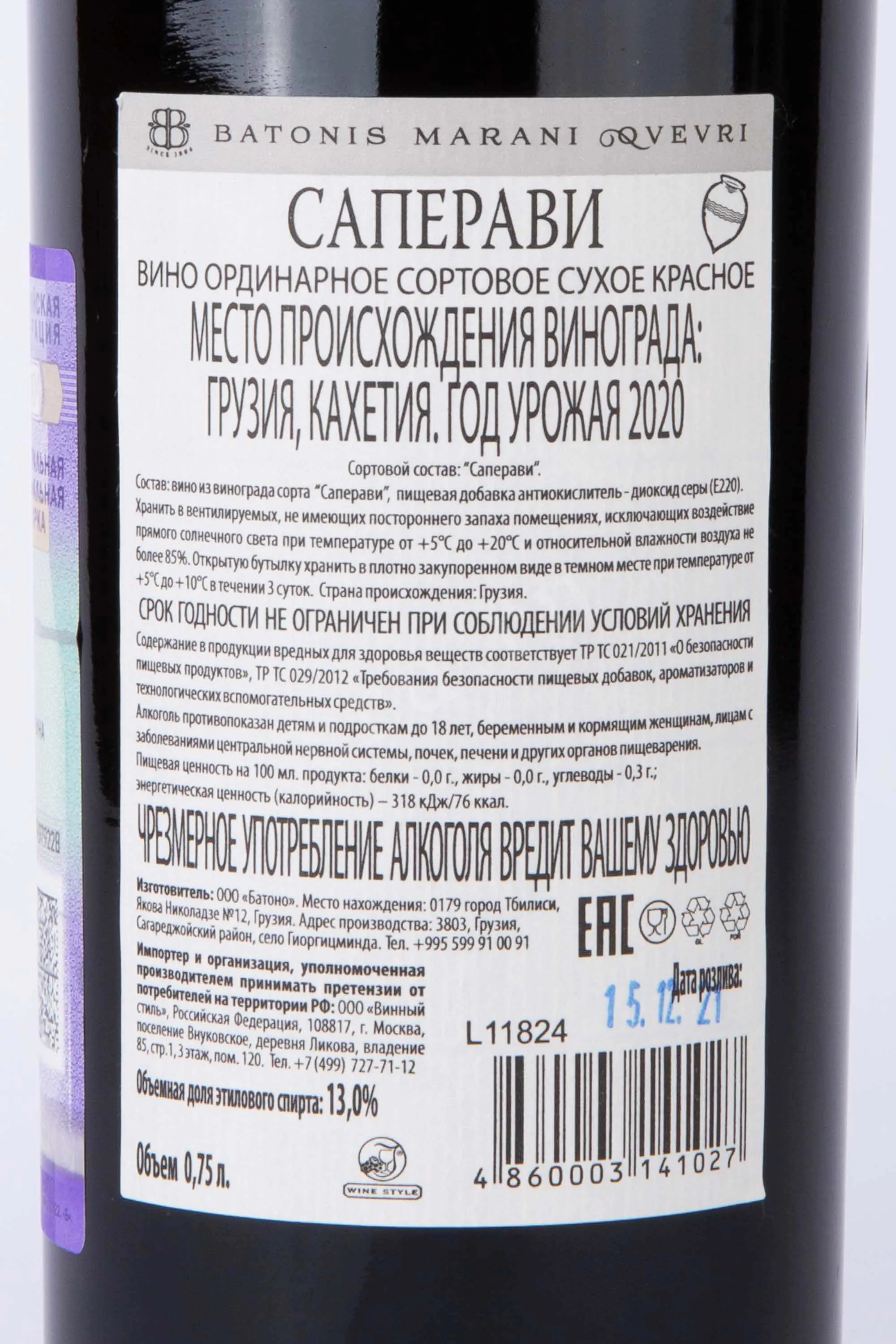 Производитель ООО «Батоно» сохраняет верность традиционным грузинским методам, используя древнюю технологию брожения и выдержки в квеври — глиняных сосудах, зарытых в землю. Такой способ позволяет вину развивать сложную структуру, натуральную танинность и характерные землисто-фруктовые оттенки, сохраняя при этом чистоту сорта.