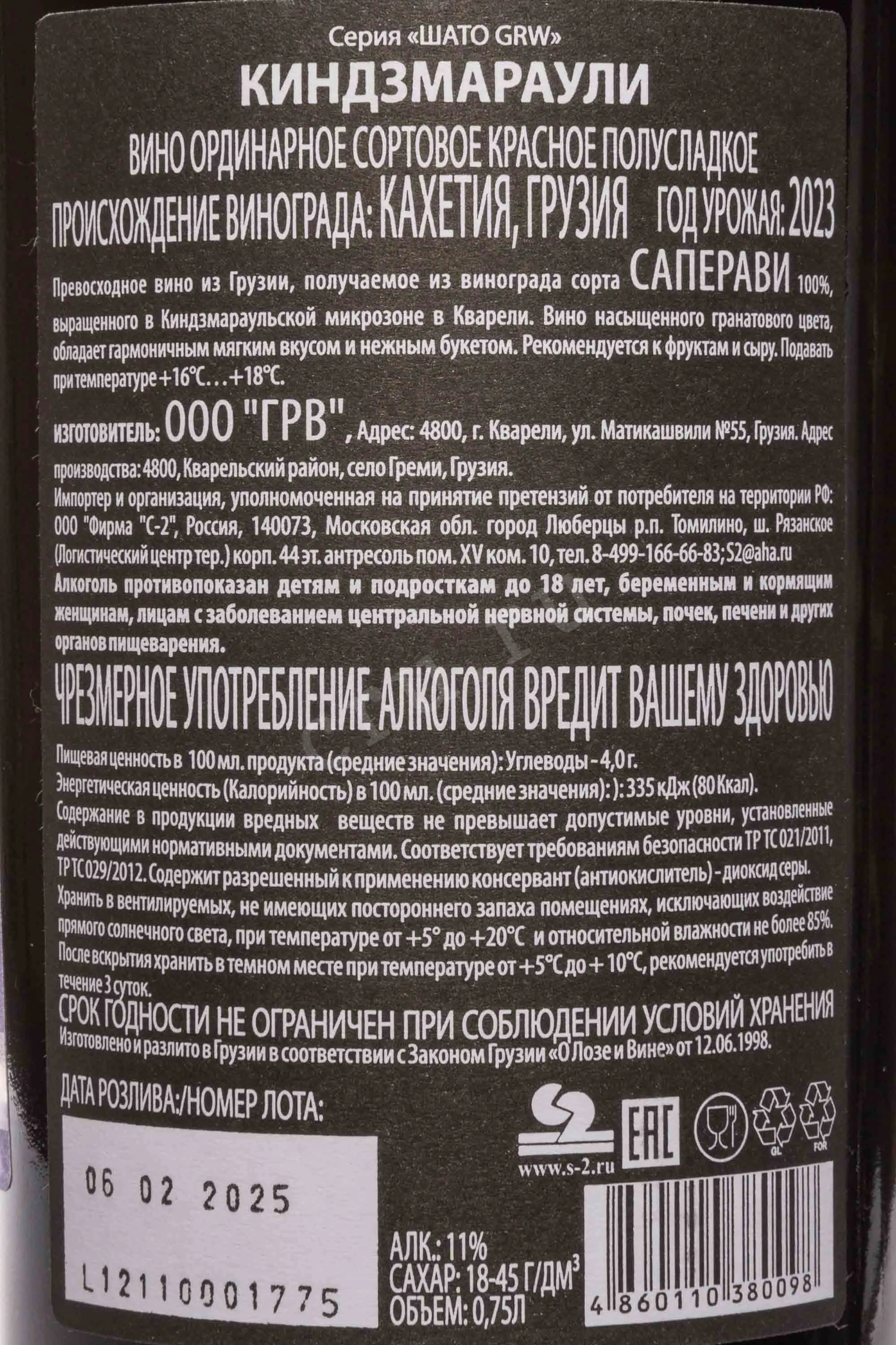 Красное полусладкое вино Chateau GRW Kindzmarauli 0,75 л входит в специальную элитную линейку «Шато GRW». Для него используется самый спелый и отборный виноград Саперави, выращенный на собственных угодьях компании Georgian Royal Wines, которые находятся в микрозоне Киндзмараули в Кварели. Сырье имеет высокий уровень сахаристости, что позволяет не добавлять сахар в процессе производства. Отделенные от веточек ягоды дробят прессом, сусло ферментируют при температуре 23-28 градусов в емкостях из нержавеющей стали с применением особого штамма дрожжей. Брожение останавливают путем охлаждения, когда уровень сахара достигает определенного уровня (18-45 г/дм куб.). Вино фильтруют и помещают для выдержки в изотермические резервуары, а через несколько месяцев бутилируют.