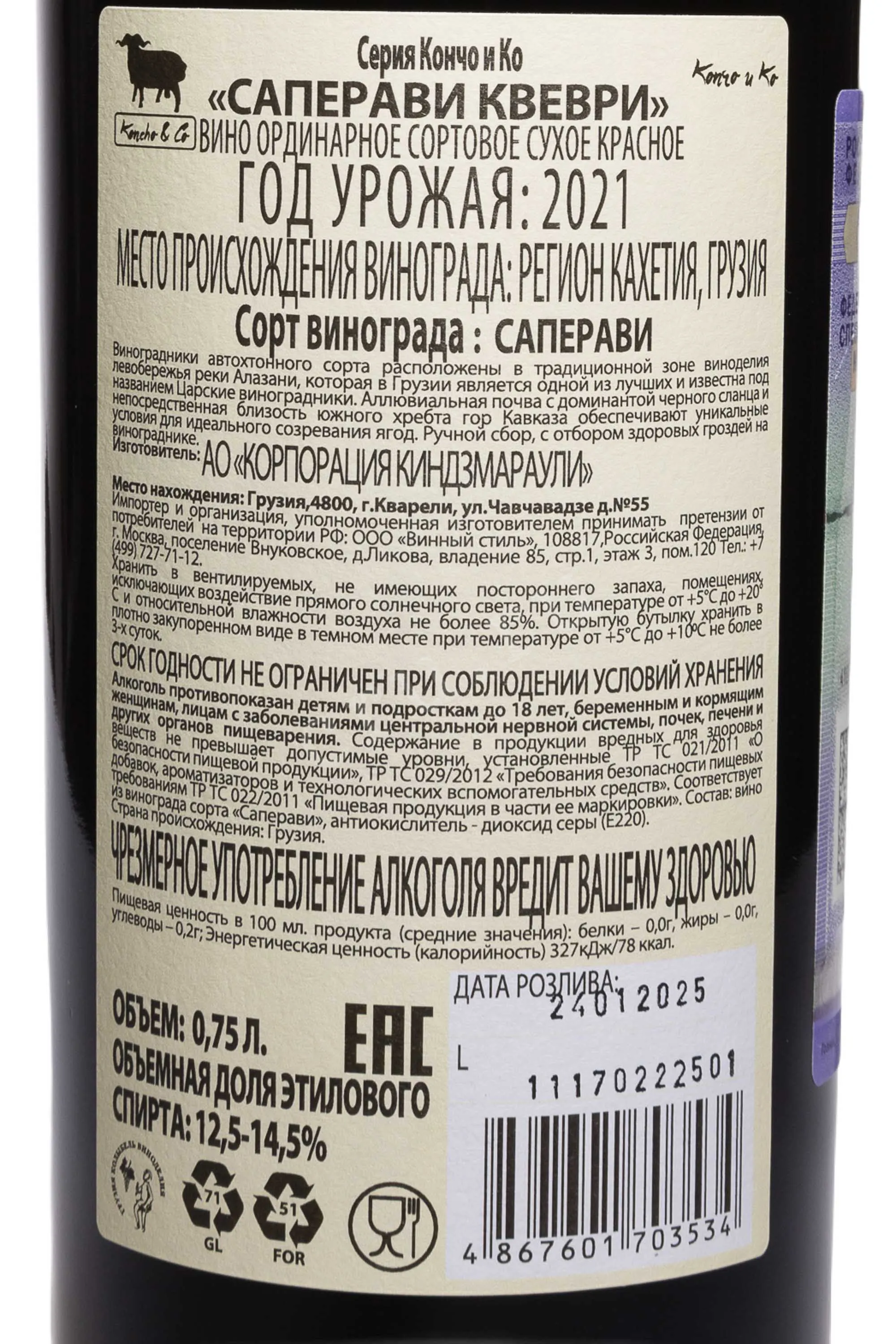 Koncho & Co Saperavi Qvevri 2021 — сортовое сухое красное вино, созданное из автохтонного винограда Саперави, выращенного в регионе Кахетия, в долине реки Алазани, известной как «Царские виноградники». Аллювиальные почвы и южные склоны Кавказа обеспечивают оптимальные условия для созревания ягод, что отражается в глубине вкуса и выразительном характере вина. Брожение и выдержка в квеври позволяют сохранить природную структуру сорта, делая напиток насыщенным, плотным и гармоничным. Ручной сбор и тщательный отбор урожая гарантируют качество каждой бутылки. Это вино хорошо раскрывается после аэрации и подойдёт как для гастрономических сочетаний, так и для самостоятельной дегустации.