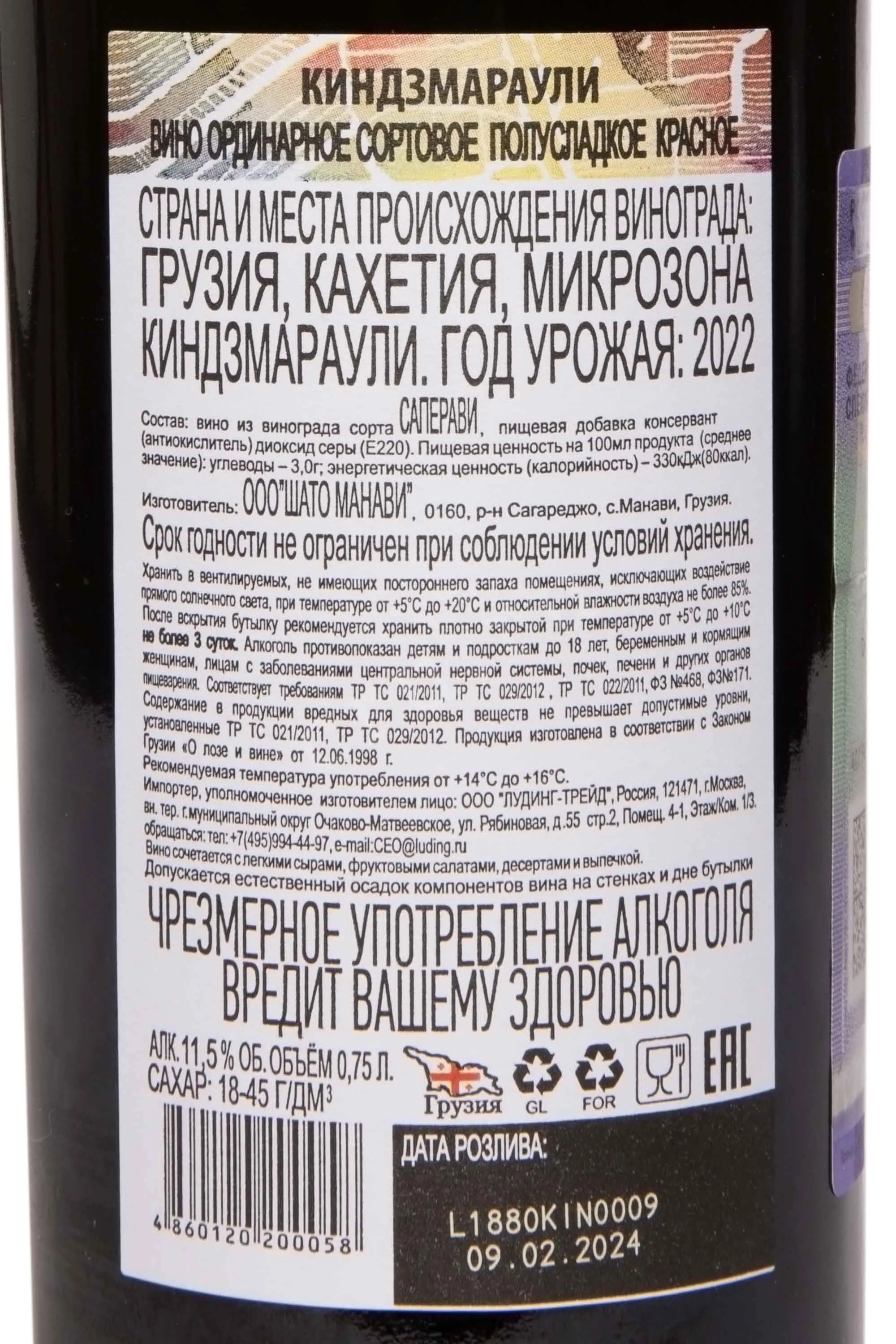 Вино красное полусладкое Chateau Manavi Kindzmarauli 0,75 л – аутентичная грузинская вариация в исполнении одного из авторитетных производителей. Напиток сделан из урожаев одного сорта винограда. Ягоды для винификации собрали в микрозоне Киндзмараули Кахетинской области. Ферментация сусла проходила в контролируемых условиях. Для получения природно-полусладкого вкуса виноградный сок охладили до окончания процесса брожения.