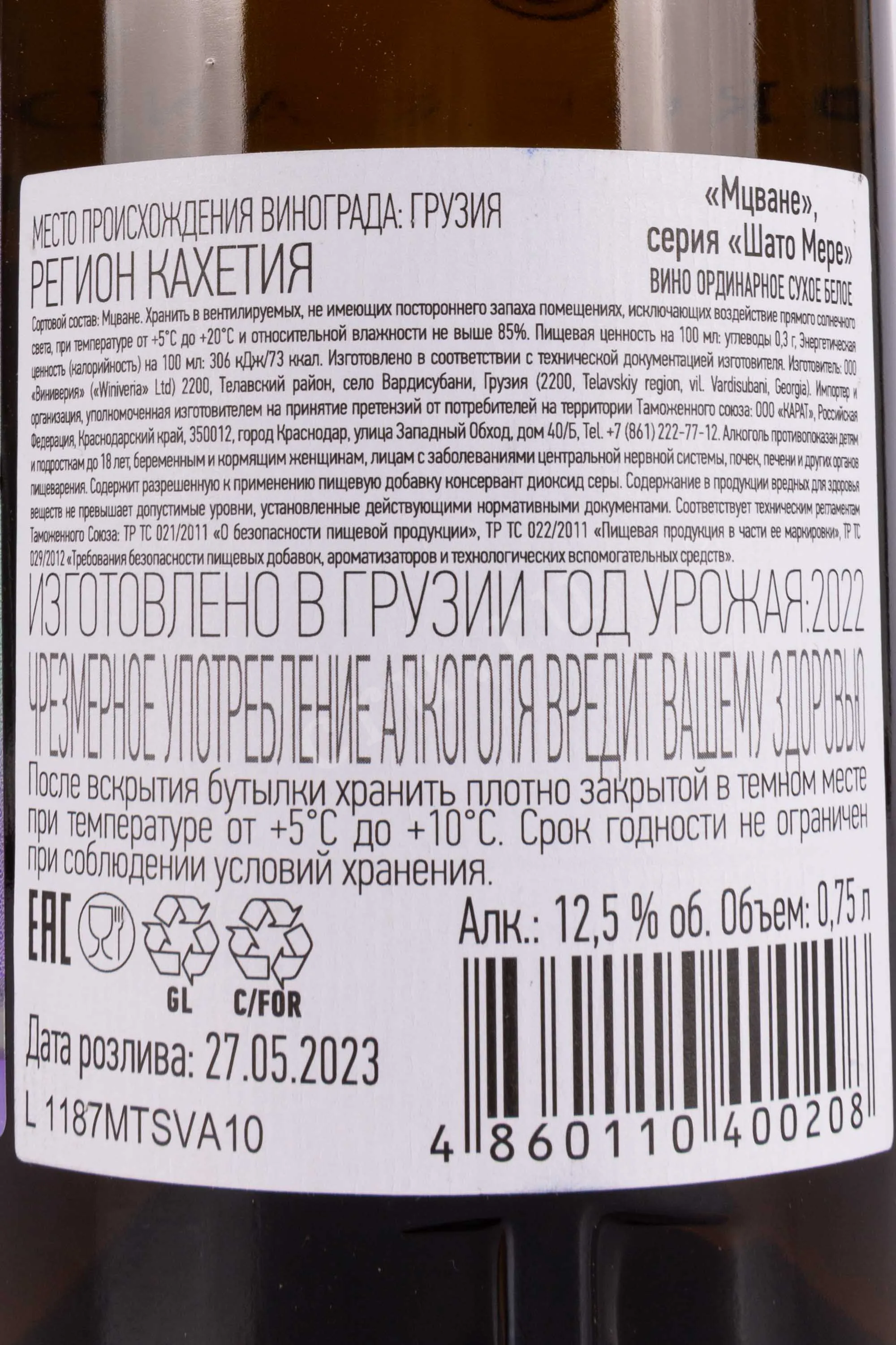 Белое сухое вино Chateau Mere Mtsvane 0,75 л — легкий, выразительный напиток, созданный на территории Кахети в Телавском районе. Это моносортовой вариант из винограда автохтонного сорта, выращенного на участках с уникальным климатом и составом почвы. Виноделы тщательно следят за зрелостью ягод и собирают их по достижении оптимальных органолептических параметров. Сусло подвергается контролируемой ферментации без контакта с кожицей. Так получают чистый и прозрачный образец.
