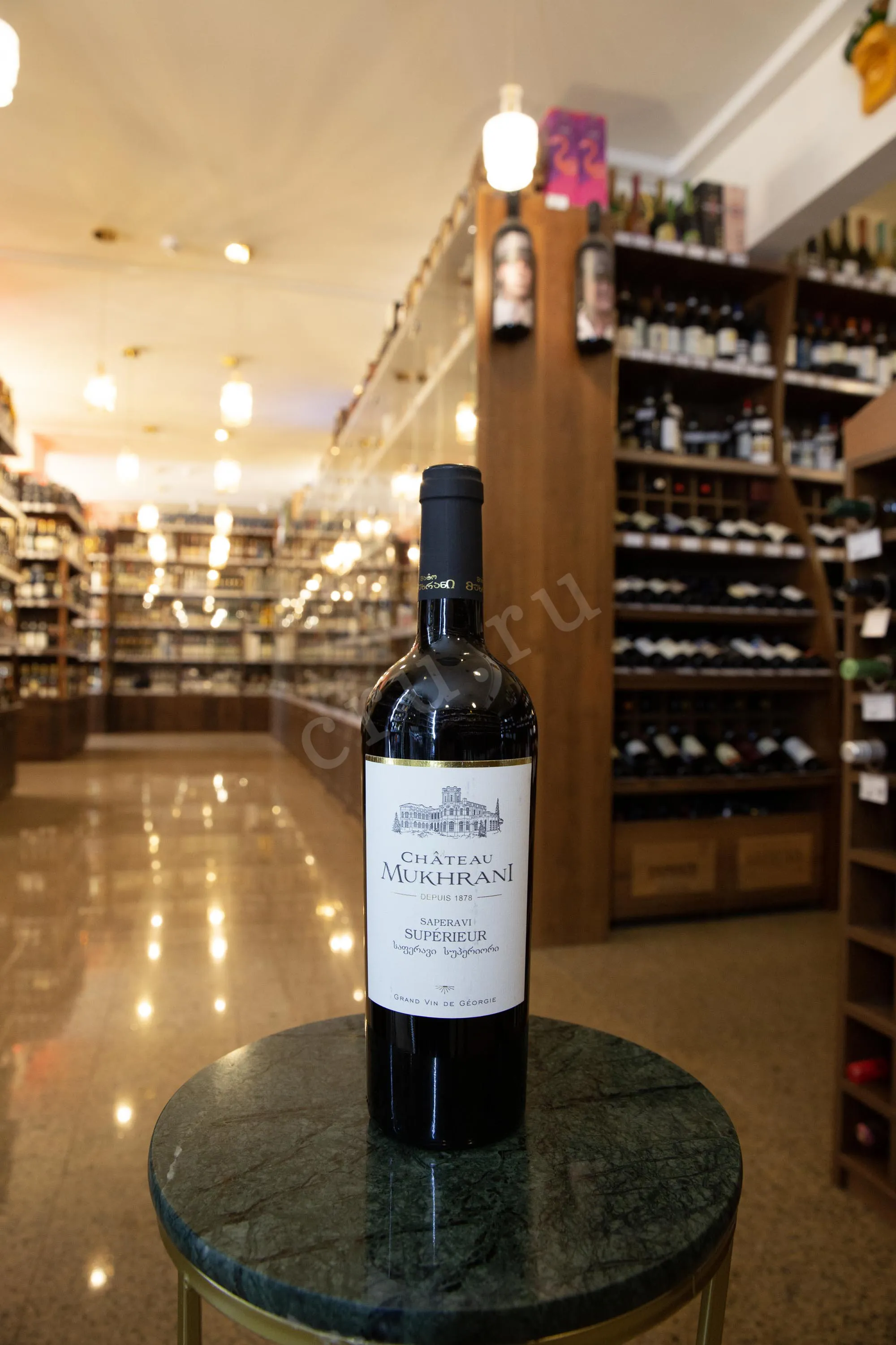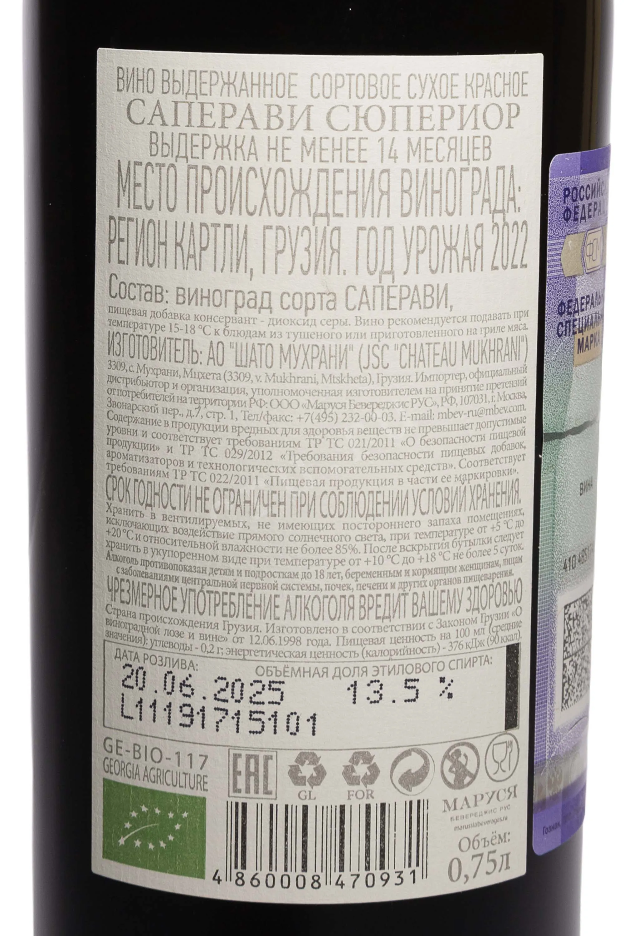 Красное сухое вино Chateau Mukhrani Saperavi Superieur 2017 г. 0,75 л – моносепажная вариация из урожаев популярной грузинской лозы. Напиток создан из ягод, созревавших на аллювиальных и суглинистых почвах. Собранные вручную плоды отправили на винодельню, где отсортировали, очистили от стеблей и измельчили с помощью дробильного оборудования. После мягкого прессования виноградный сок сбраживался при контролируемой температуре не выше 28 градусов. Часть сусла подвергли выдержке в дубе, а перед бутилированием партии спиртного смешали.
