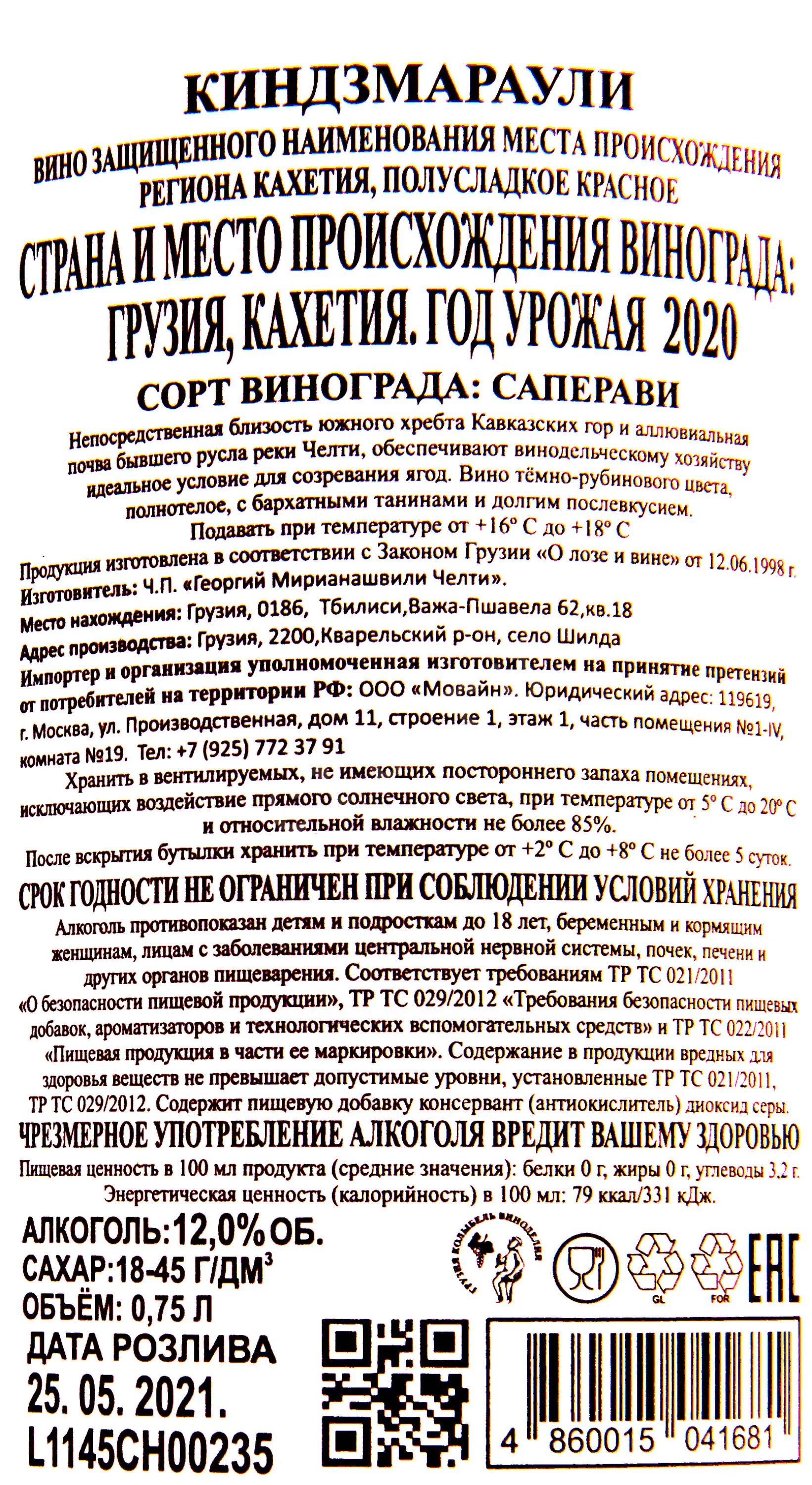 Красное полусладкое вино Челти Киндзмараули 0,75 л 2020 года имеет престижную категорию ЗНМП (защищенное наименование по месту происхождения), отличается мягким вкусом и насыщенным ароматом. Производится в микрозоне Киндзмараули в регионе Кахетия. Здесь виноград сорта Саперави растёт на солнечных склонах у подножия Кавказских гор. Почвы глинистые с примесью галечника, что даёт ягодам баланс между кислотностью и сахаром. Урожай был собран в конце ноября, когда виноград достиг максимальной спелости и накопил большое количество сахара. Ферментация проходила при контролируемой температуре с остановкой процесса на нужной стадии, чтобы сохранить природную сладость. Вино не выдерживается в дубе, что позволяет сохранить чистый сортовой вкус. Челти Киндзмараули получило награды на международных выставках. Его отмечают за сбалансированный вкус и высокое качество.