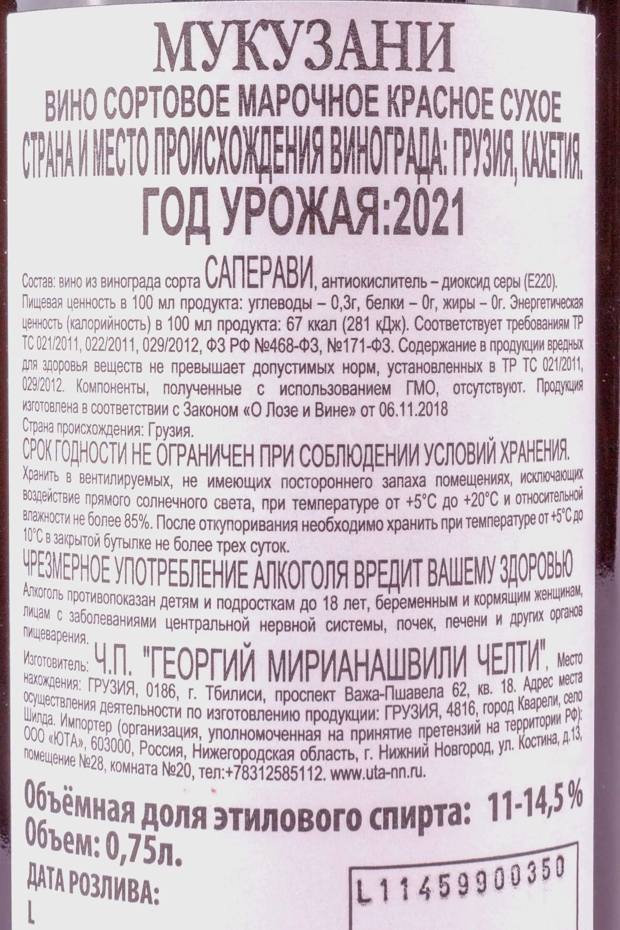 Красное сухое вино Chelti Mukuzani 0,75 л производится на грузинском винодельческом предприятии, расположенном в известном винодельческом регионе Кахети. Виноградники хозяйства занимают плодородные земли, где выращивают местный сорт Саперави. После ручного сбора виноград подвергается классической винификации, затем напиток выдерживается не менее 6 месяцев, приобретая сложный, многогранный характер. Особенность этого моносортового релиза — гармоничный баланс вкуса и аромата, присущий вину защищенного географического указания (ЗГУ) «Мукузани».