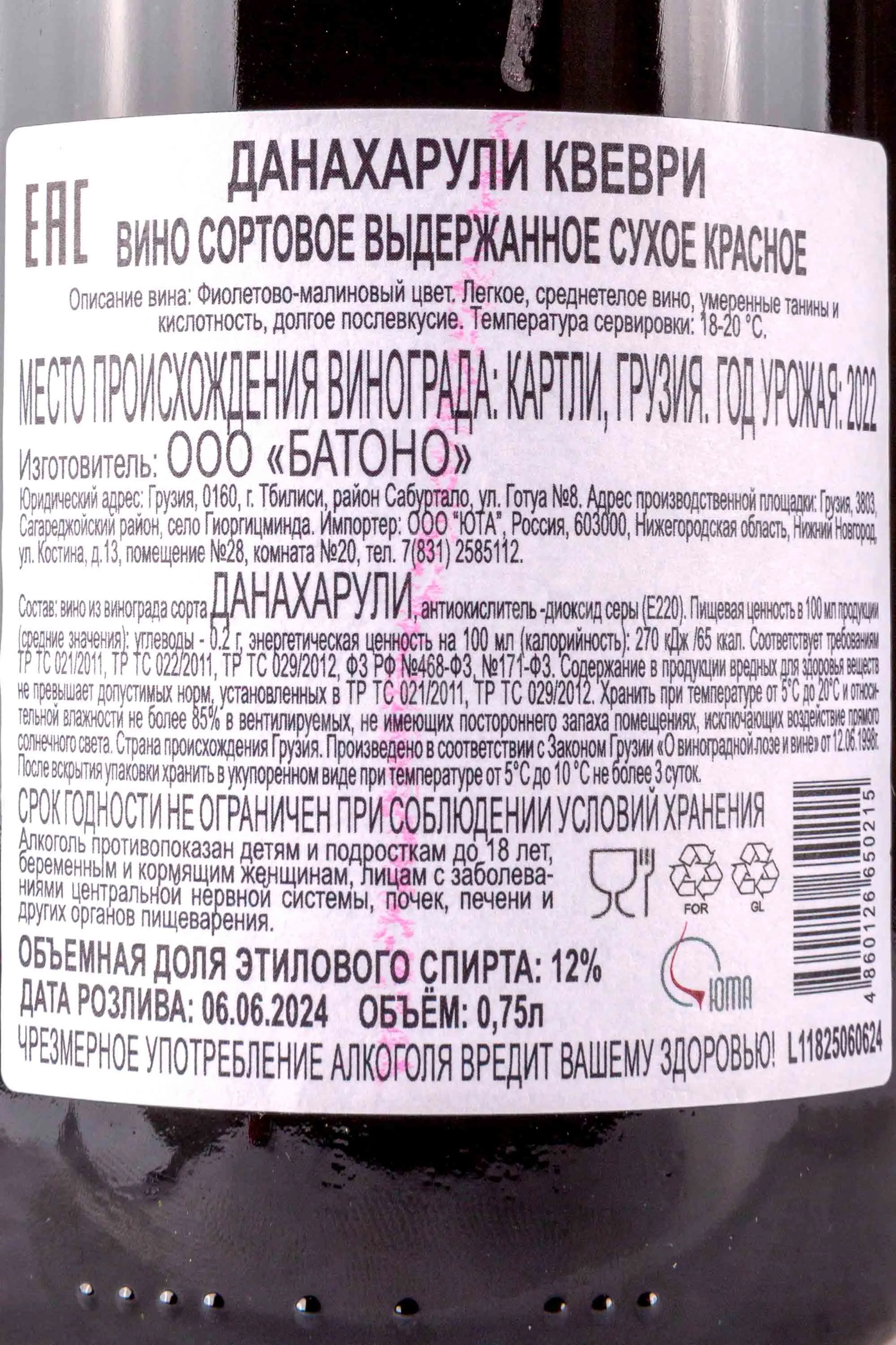 Вино Ладошка и Патара Данахарули Квеври 0,75 л производилось на винодельне ООО «Батоно», расположенной в историческом регионе Картли, Грузия. Напиток создавался из редкого аборигенного сорта Данахарули, выращенного на почвах с уникальным сочетанием минерального состава и солнечного климата. Урожай собирался вручную, что обеспечивало отбор только лучших гроздей. После сбора ягоды проходили традиционную грузинскую ферментацию и выдержку в квеври — глиняных амфорах, погружённых в землю. Такой способ сохранял природную силу и насыщенность сорта, формируя характерный стиль напитка. Выдержка длилась не менее шести месяцев, что придавало ему глубину вкуса и выразительный аромат, отражая терруар региона и культурное наследие грузинского виноделия.