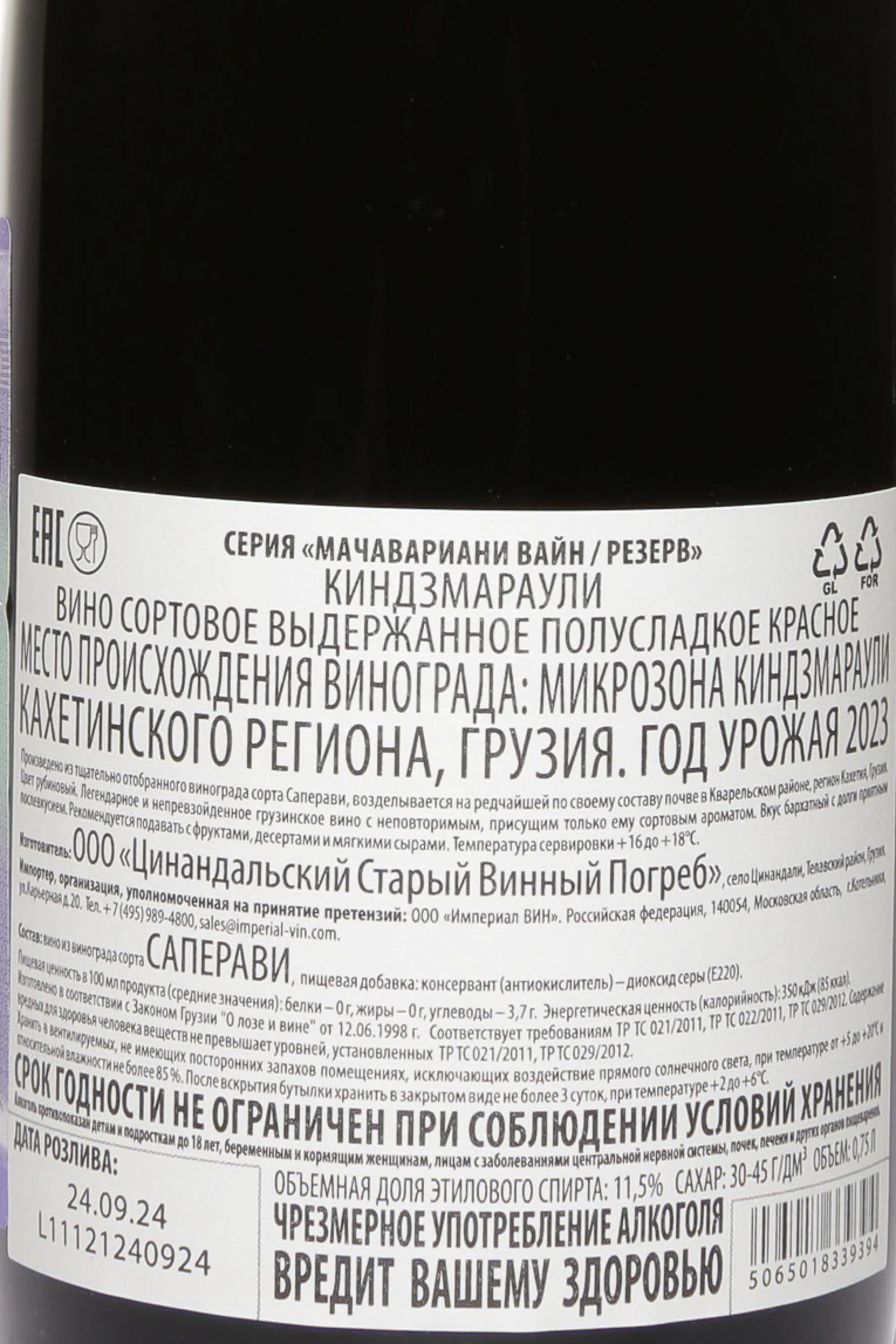 Красное полусладкое вино David Machavariani Kindzmarauli Reserve 2023 года 0,75 л изготовлено из винограда сорта Саперави, выращенного в микрозоне Киндзмараули в регионе Кахетия. Этот терруар отличается мягким климатом и плодородными почвами, которые придают винограду характерную насыщенность и фруктовую сладость. Урожай собирают вручную позже обычного срока (с максимальным содержанием сахаров), после чего ягоды проходят традиционную ферментацию в глиняных сосудах (квеври). Выдержка вина осуществляется на осадке при постоянной температуре, что придаёт напитку особую гармоничность. Вино ценится за насыщенный стиль и традиционную грузинскую аутентичность, отмечено экспертами за сбалансированность и яркий характер.