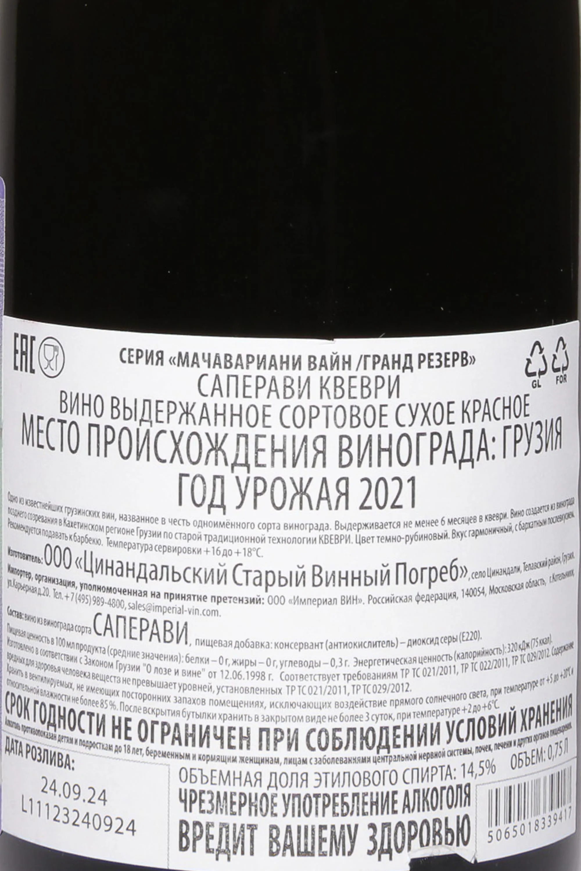 Красное сухое вино David Machavariani Saperavi Qvevri Grand Reserve 2021 года 0,75 л создано по традиционной грузинской технологии в квеври — больших глиняных амфорах, закопанных в землю. Виноград выращивают в знаменитом винном регионе Кахетия, где благоприятный климат и почвы дают ягодам высокую концентрацию вкуса и аромата. Ферментация проходит естественным способом на мезге с последующей выдержкой в квеври не менее 12 месяцев. Особенность вина — старинная технология, признанная ЮНЕСКО объектом культурного наследия человечества, и высокие оценки критиков за выраженный характер и многогранность вкуса.