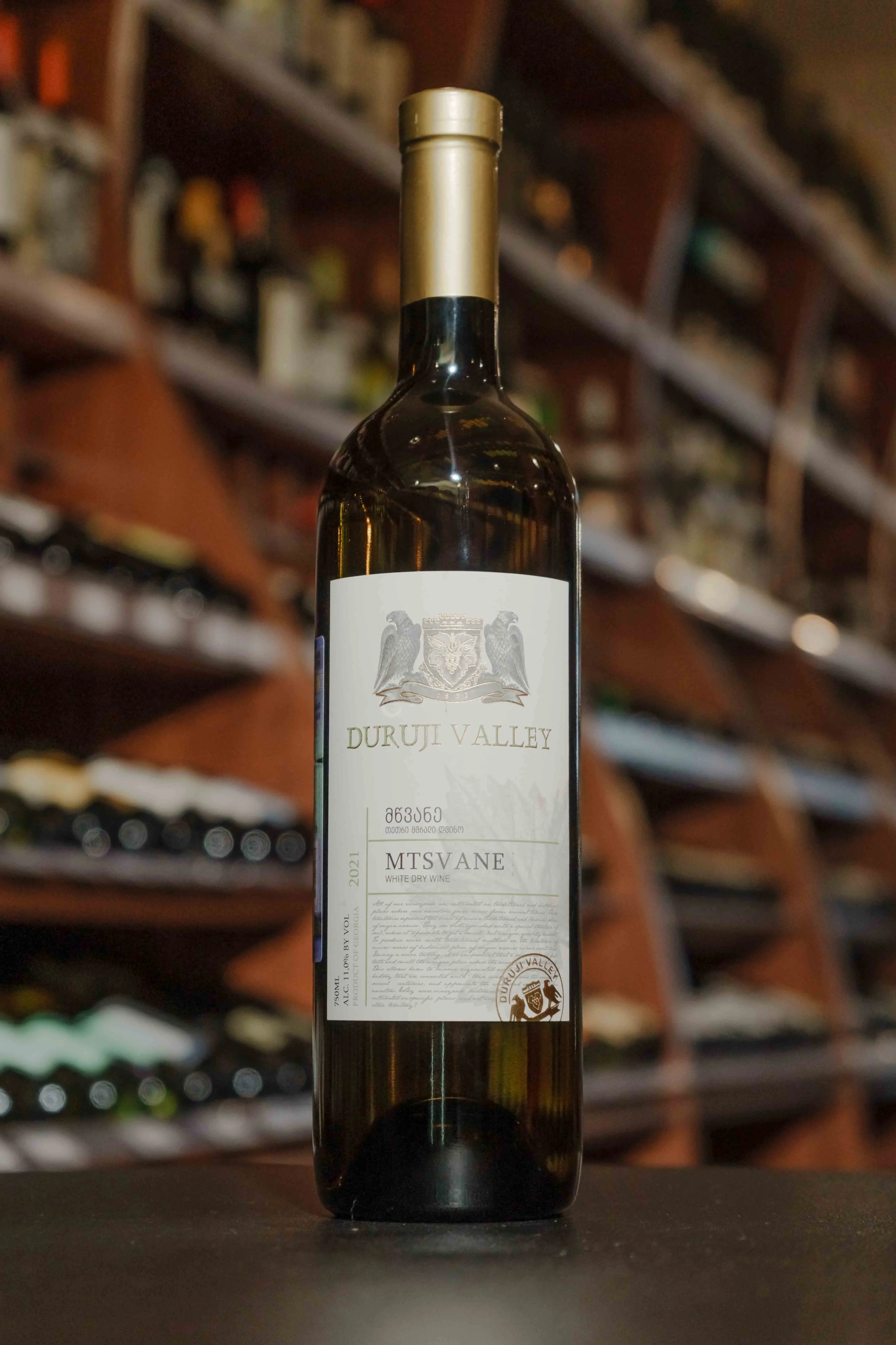 Вино Duruji Valley Mtsvane 2019 0.75 л – белая сухая вариация от грузинского производителя, изготовленная из аборигенного сорта винограда, культивируемого на кахетинских виноградниках в долине реки Дуруджи, почвы которых богаты сланцем, а уникальные геоклиматические условия позволяют собирать отличный урожай с лоз со средним возрастом 16 лет. Сбор спелых ягод производился вручную в начале октября 2019 года. Вино создавалось на современном оборудовании, но с учетом древних грузинских традиций. На винодельне виноград снимают с гребней и мягко отжимают. Ферментация производится при строгом термоконтроле в 17-19 градусов.