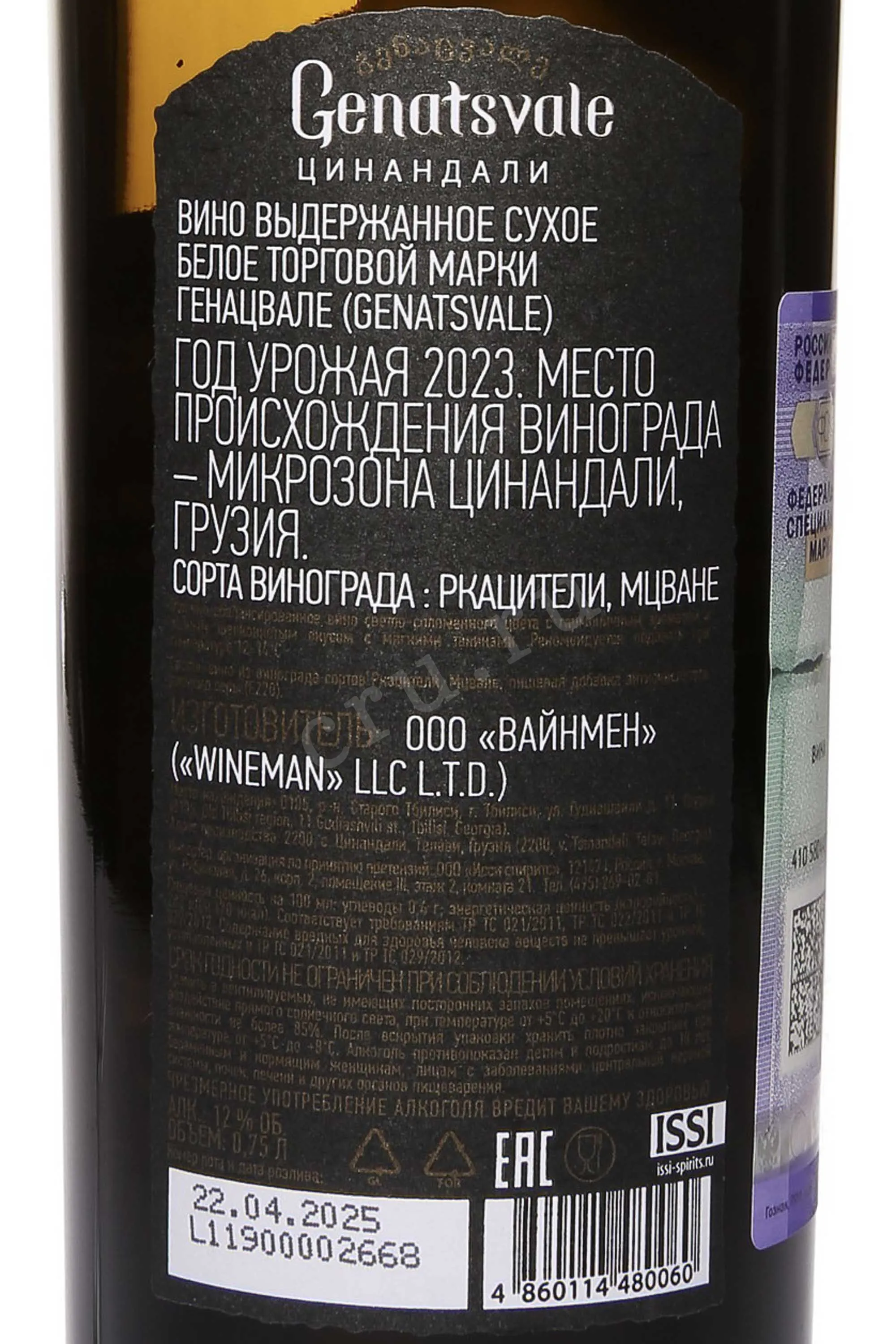 Белое сухое вино Genatsvale Tsinandali 0,75 л выпускается винодельческой компанией Вайнмэн, основанной семьей Бессини. Производится по традиционной грузинской технологии в соответствии с категорией защищённого наименования места происхождения (ЗНМП). Это означает, что виноград выращен и обработан исключительно в регионе Цинандали. Напиток создаётся из местных автохтонных сортов винограда Ркацители и Мцване, которые после сбора проходят бережную ферментацию в стальных ёмкостях, сохраняющих свежесть и яркость вкуса. Особенностью купажа является его гармоничная сбалансированность, выраженная в сочетании пряности и фруктовой сочности.