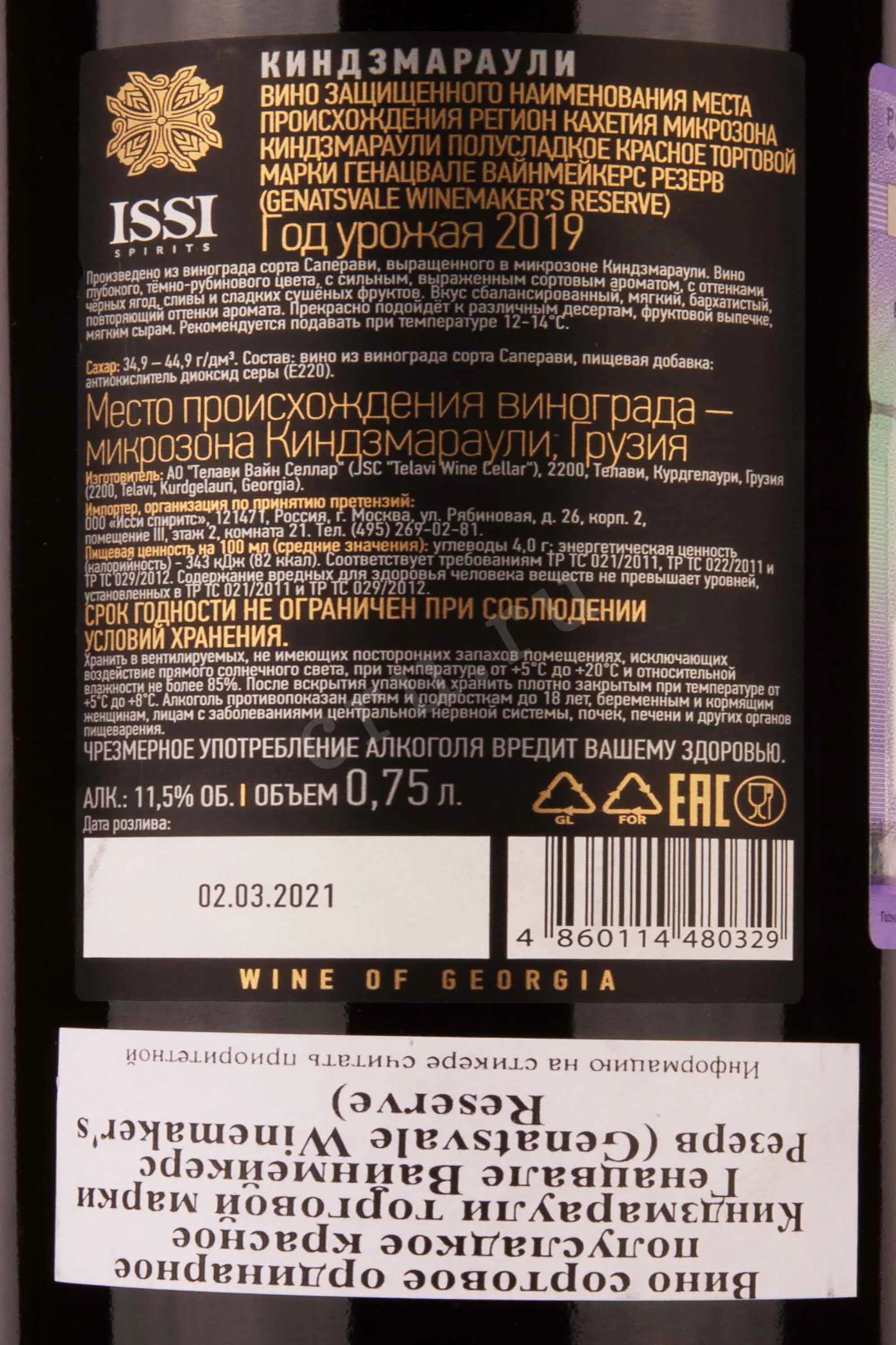 Красное полусладкое вино Genatsvale Winemaker's Reserve Kindzmarauli 0,75 л производится известной грузинской компанией Телави Вайн Селларс в зоне с защищённым географическим указанием Киндзмараули. Особенность этого напитка — использование автохтонного грузинского сорта винограда Саперави, который отличается высокой концентрацией сахаров и глубоким цветом. Для сохранения естественной сладости ферментацию сусла останавливают охлаждением и выдерживают продолжительное время. Такой подход придаёт образцу характерную мягкость и насыщенность, а благодаря щадящей технологии производства он приобретает уникальный баланс фруктовой сладости и лёгкой бархатистости текстуры.