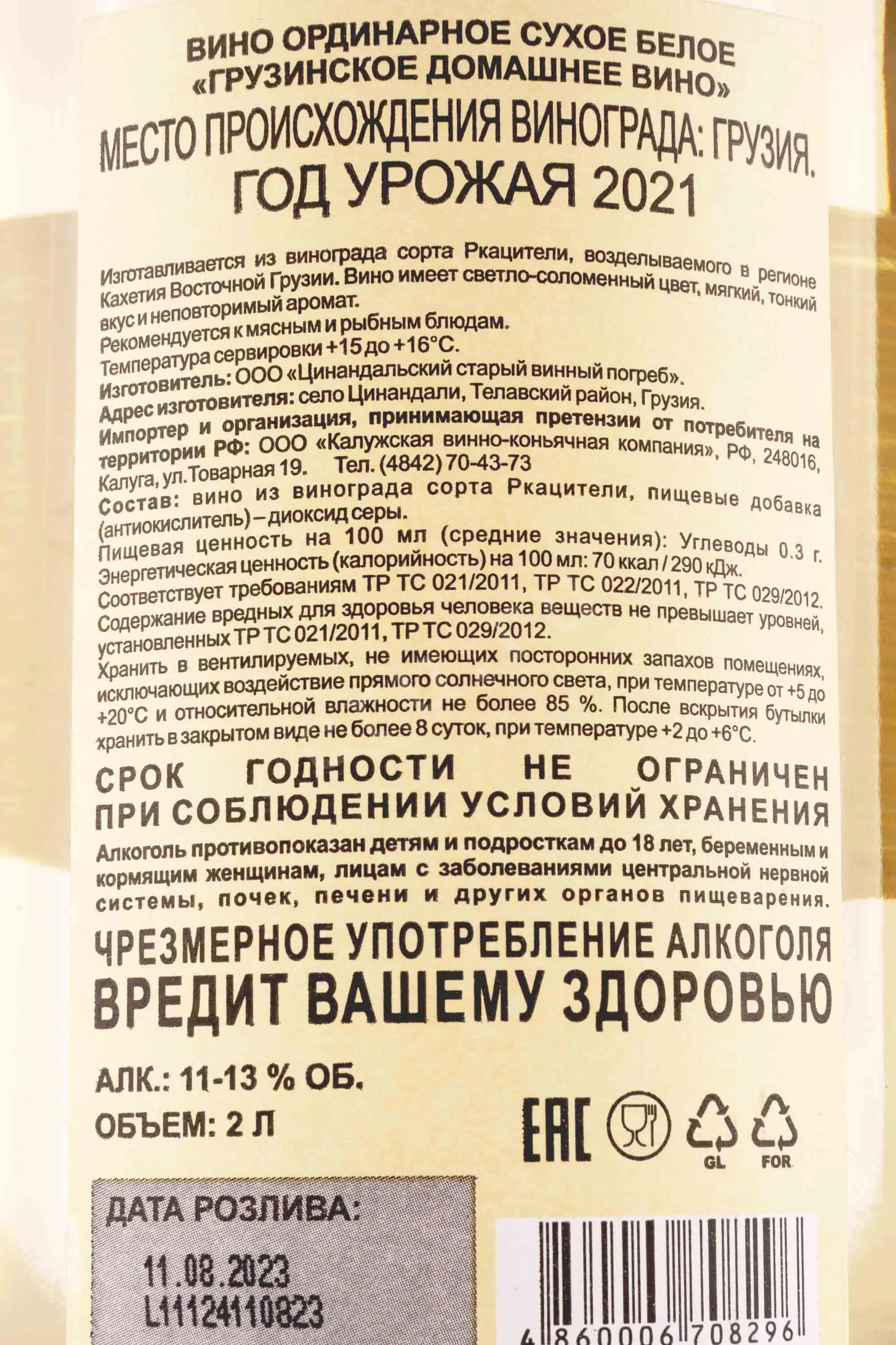 Грузинское вино Домашнее белое сухое 2,0 л создано винодельней ЦСВП с сохранением традиционной технологии, бережно передаваемой из поколения в поколение. Напиток изготовлен из автохтонного сорта винограда Ркацители, выращенного на солнечных склонах Кахетии — региона, где перепады дневных и ночных температур способствуют медленному созреванию ягод и накоплению сбалансированной кислотности. Сбор винограда проводился вручную, чтобы сохранить целостность плодов и природный аромат. После мягкого прессования сусло проходило ферментацию в нейтральных емкостях при контролируемой температуре, что позволило раскрыть естественную свежесть и характерную миндально-цветочную палитру. Терруар с известково-глинистыми почвами придал напитку тонкую минеральность, подчеркивающую гармонию структуры и деликатную элегантность вкуса.