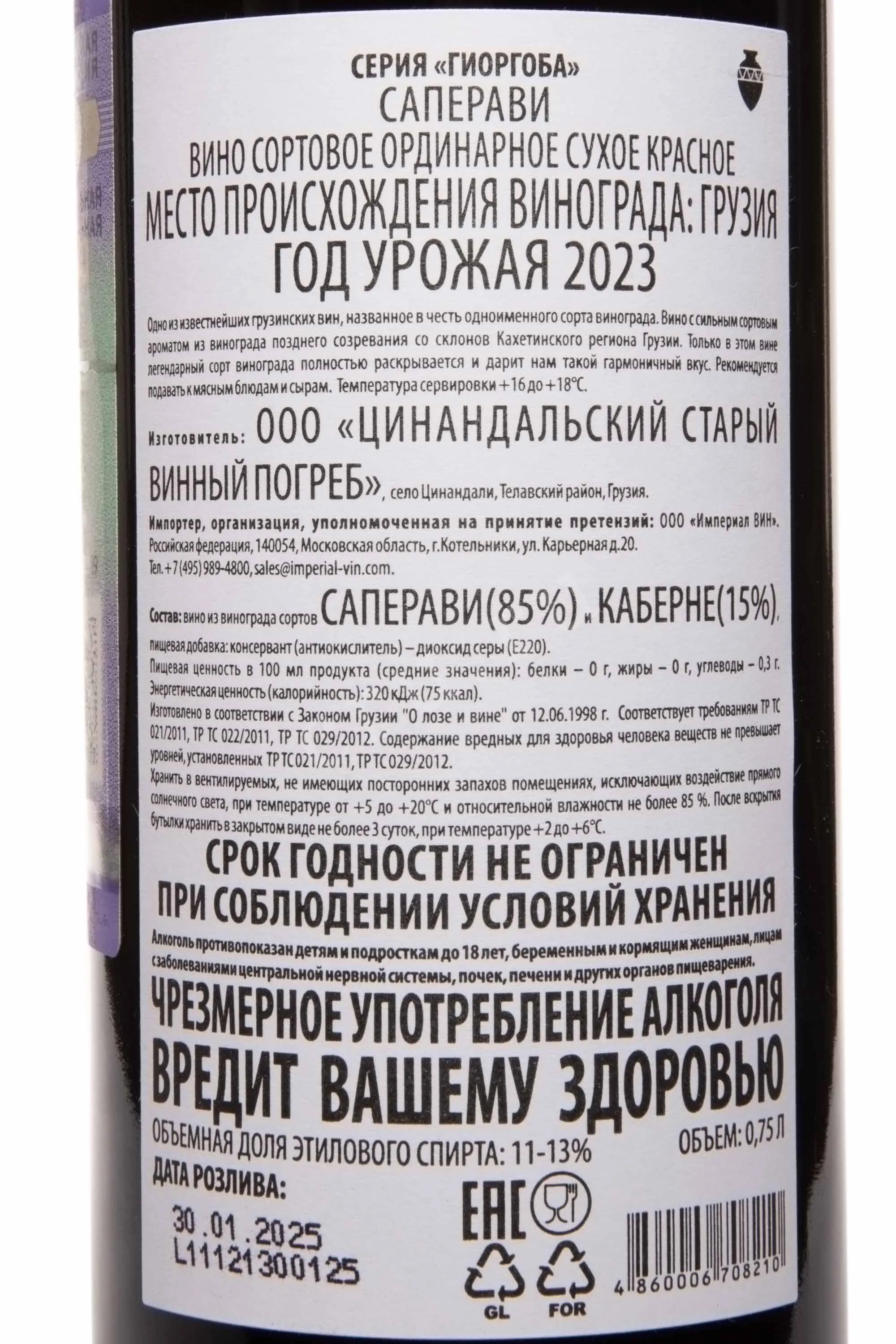 Красное сухое вино Giorgoba Saperavi 2023 г. 0,75 л — это результат сочетания традиций грузинского виноделия и современных методов ферментации. Виноград для создания напитка выращен в Кахетии, где глинисто-каменистые почвы способствуют формированию глубоких танинов и богатых ароматических свойств. Год сбора урожая выдался засушливым, уровень осадков в регионе снизился примерно на 20%, а среднесуточная температура в июле и августе держалась около 28 °C. Ягоды созревали быстро, накапливая концентрированный сахар, при этом сохранялась сбалансированная кислотность. Сбор проходил вручную в конце сентября, когда грозди достигали оптимальной зрелости. Сразу после отделения от гребней виноград отправили на короткую холодную мацерацию, позволяющую извлечь максимум цвета и вкусовых компонентов. Затем сусло бродило при контролируемой температуре 22–24 °C. По окончании ферментации вино перелили в дубовые бочки для дальнейшей выдержки, продолжавшейся около девяти месяцев.
