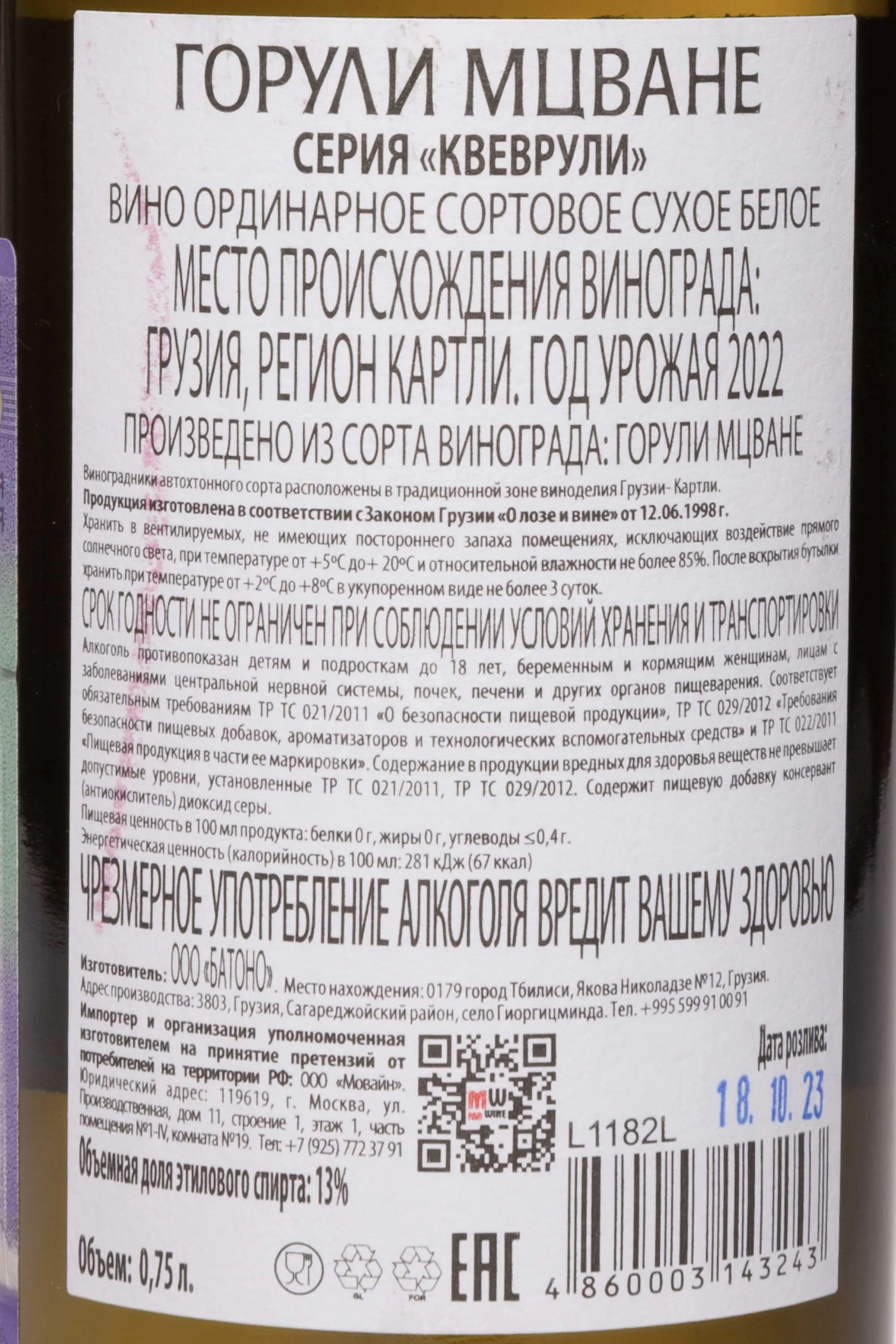 Qvevruli Goruli Mtsvane 2019 0,75 л производит грузинская винодельческая компания «Батоно», расположенная в регионе Шида-Картли, в городе Гори. В основе вина автохтонный белый сорт Горули Мцване, выращенный в уникальных климатических условиях этой местности. Урожай собирают вручную и ферментируют по традиционному методу в глиняных сосудах квеври, что придаёт вину особенную текстуру и глубокий, насыщенный ароматический профиль. Благодаря этому способу винификации напиток приобретает выразительную индивидуальность и ярко отражает региональные традиции.