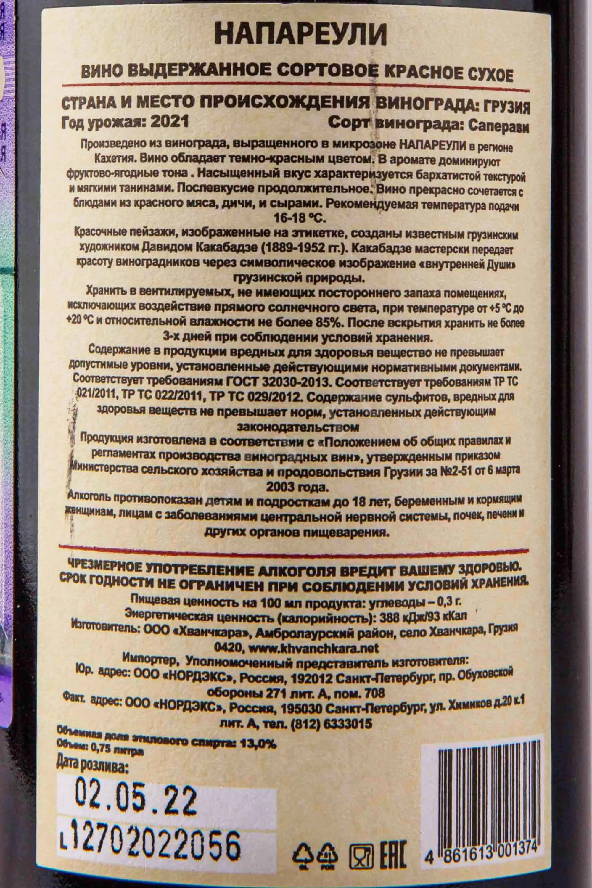 Вино Какабадзе Напареули 0,75 л было создано на винодельне ООО «Хванчкара», расположенной в сердце Кахетии — древнего региона Грузии, где виноград выращивали ещё с античных времён. Для производства использовались исключительно ягоды автохтонного сорта Саперави, собранные на каменисто-глинистых почвах долины Алазанской низины, впитывающих солнце и прохладу горных ветров. После традиционного кахетинского брожения напиток выдерживали не менее пяти лет в дубовых бочках, благодаря чему он приобрёл сложный букет и благородную структуру. Долгое созревание смягчило природную насыщенность и подчеркнуло гармонию между яркой фруктовостью и благородной терпкостью. Напиток вобрал в себя характер терруара Напареули — земли, где солнечные склоны и контрастные температуры придавали ягодам насыщенный вкус и аромат, а дубовая выдержка завершила их превращение в благородный грузинский шедевр.