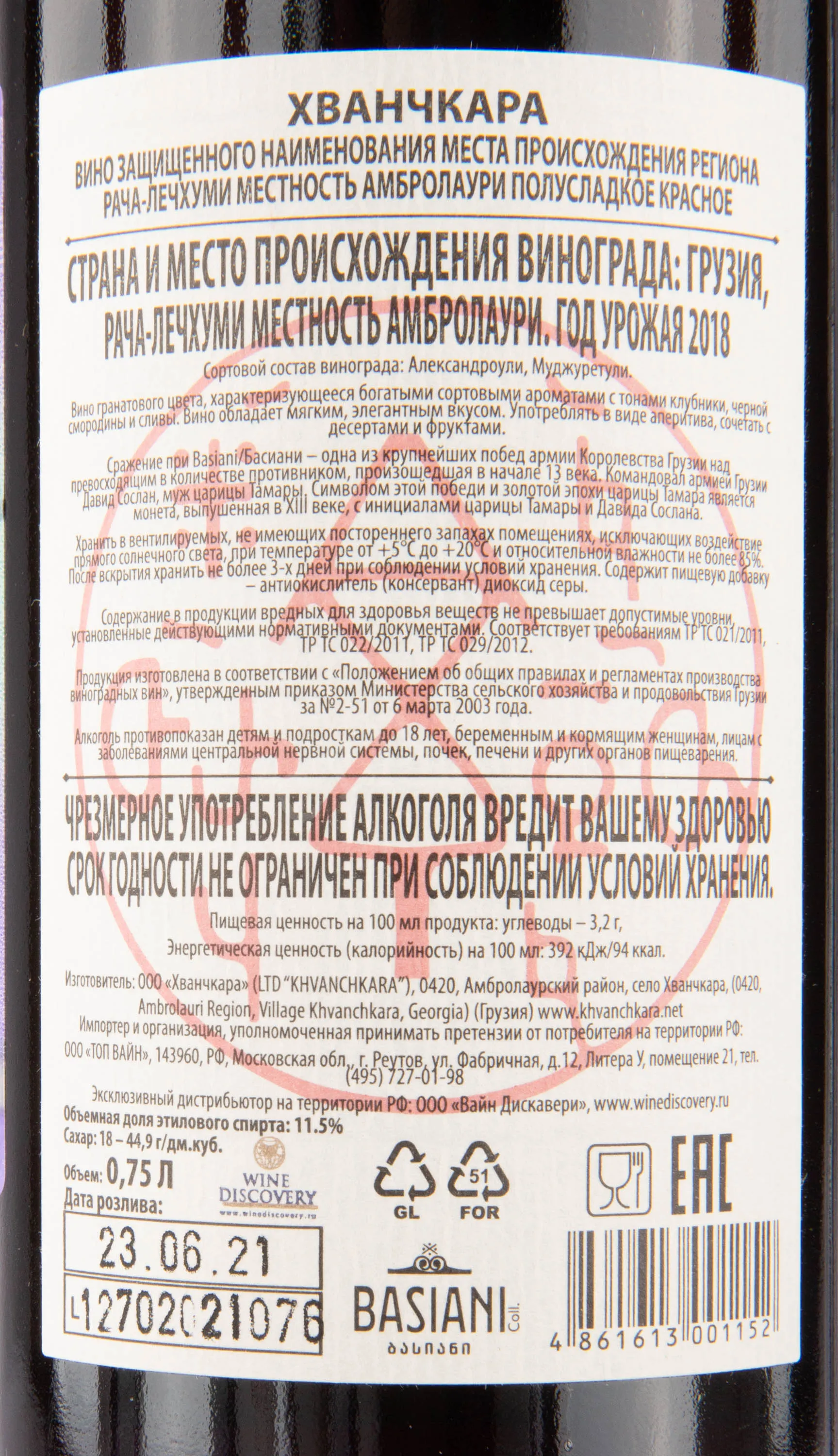 Вино красное полусладкое Khvanchkara Basiani 0,75 л – одна из национальных разновидностей грузинского спиртного. Она изготовлена из винограда Рача-Лечхумской области. Ягоды собрали в специфической зоне Хванчкара, в окрестностях одноименного поселка. Напиток отличается восхитительным мягким вкусом, который получился в результате прерывания процесса брожения сусла методом охлаждения.