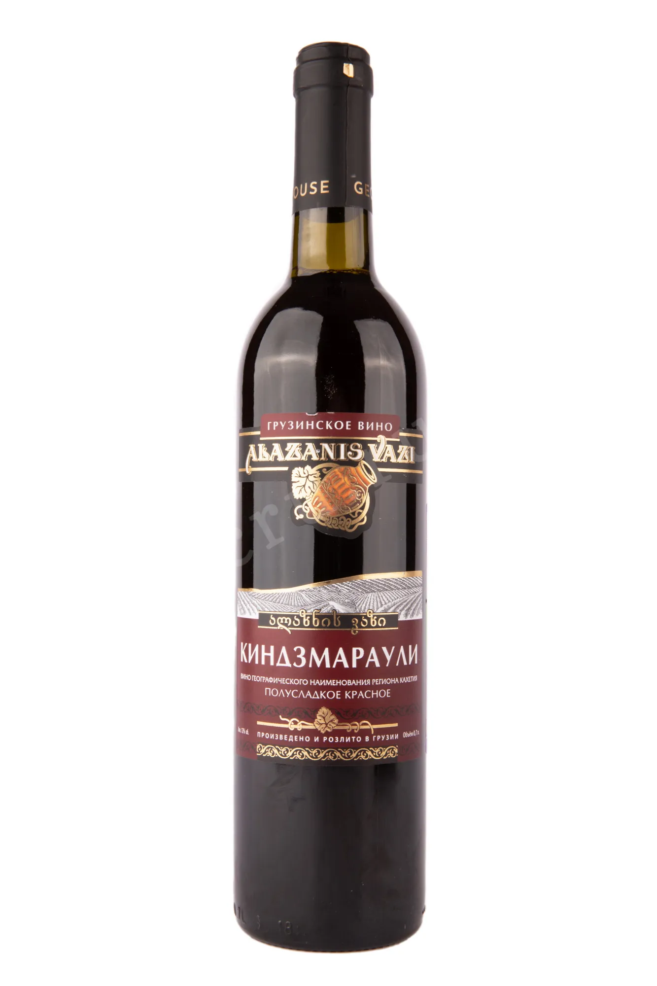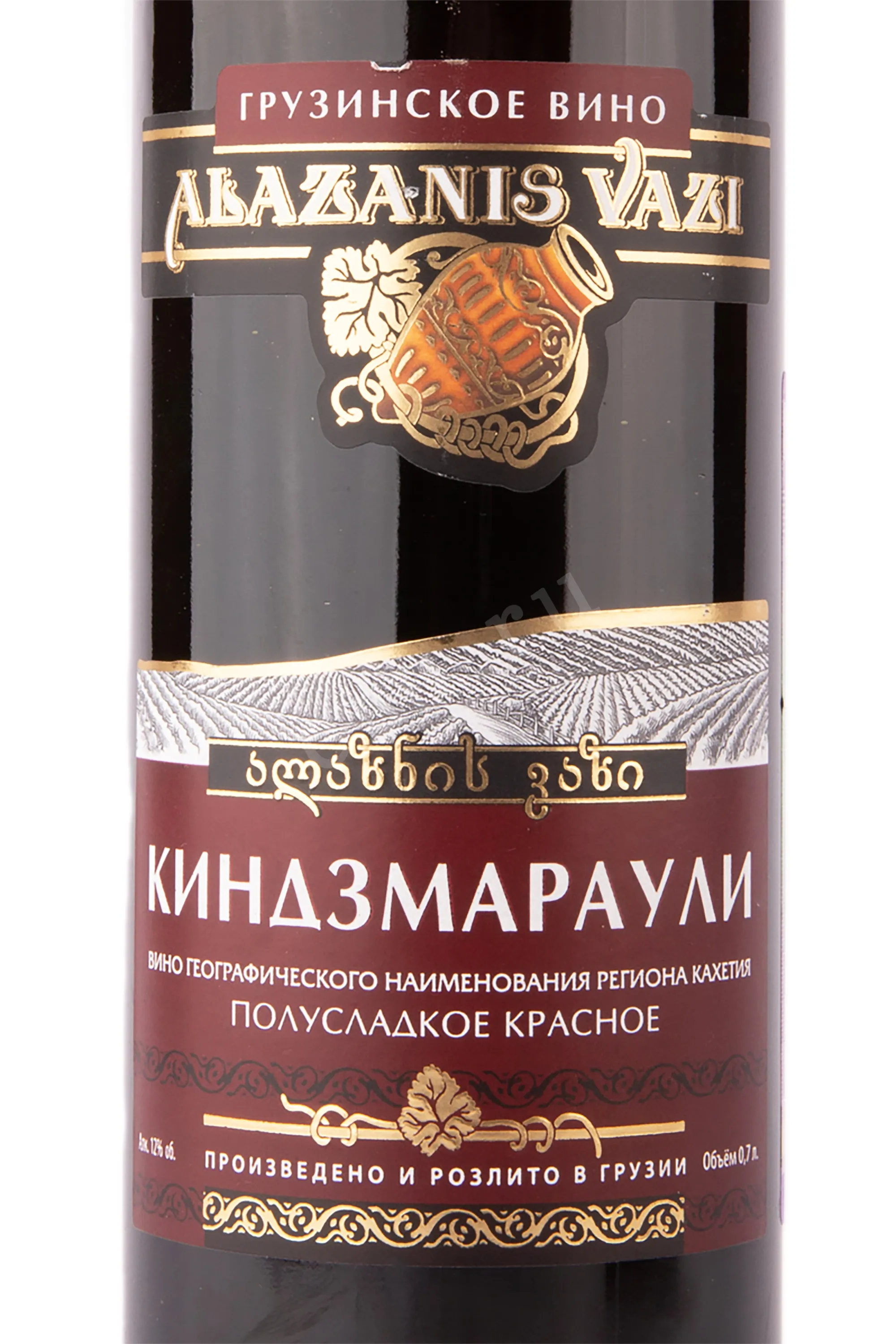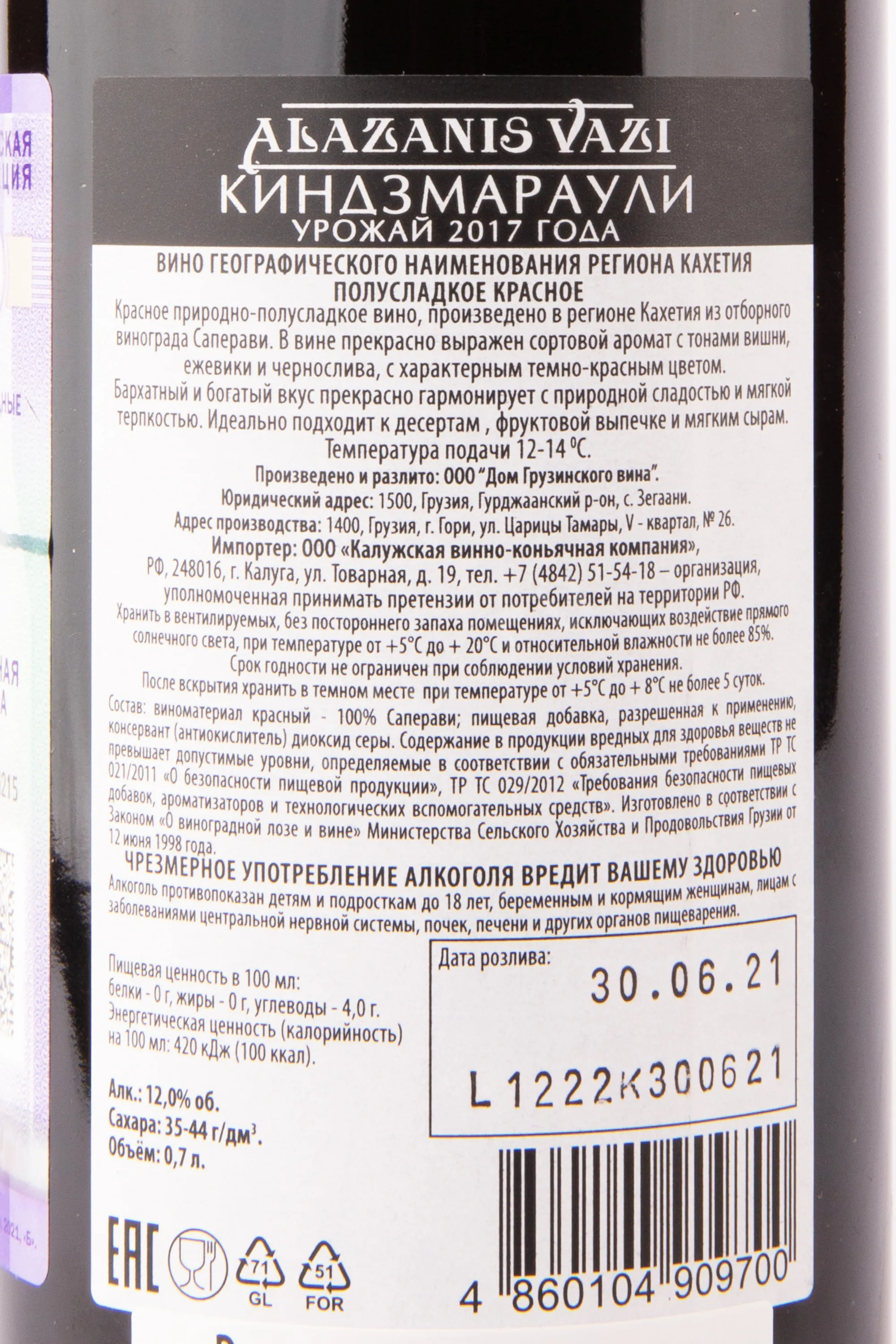Красное полусладкое вино Kindzmarauli Alazanis Vazi 2017 г. — знаменитый напиток защищенного географического наименования, который может изготавливаться только в микрозоне Киндзмараули на территории Алазанской долины (регион Кахетия). Этот 12-градусный алкоголь является винтажным, т. к. состоит из сырья одного урожайного сезона. Ягоды собрали, когда сахаристость достигла 22%, и подвергли мацерации и ферментации.