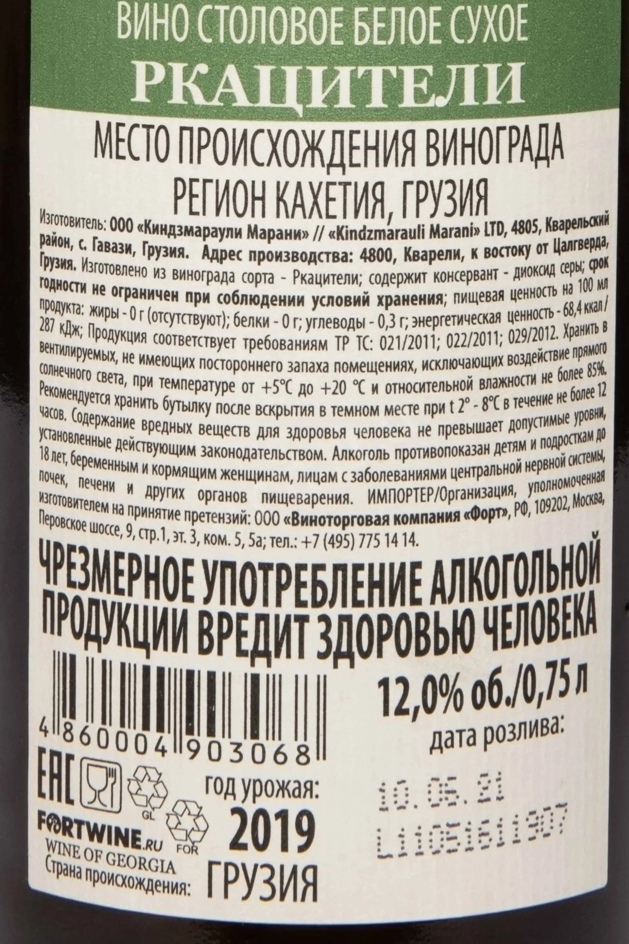 Белое сухое вино Kindzmarauli Marani Rkatsiteli 0,75 л изготовлено из одного автохтонного сорта, который культивируется в Кварельском районе Кахетии. Уникальный терруар оказывает сильное влияние на органолептику сырья, что отражается и на неповторимой стилистике напитка. В основе производства лежат старинные кахетинские традиции. Сбор урожая осуществляется в середине сентября, когда виноград достигает оптимальной зрелости. Ягоды отделяют от веточек, прессуют, сусло помещают в стальные чаны с терморегуляцией и подвергают медленному брожению. Вино некоторое время выдерживается в стали и бутилируется после фильтрации и стабилизации.