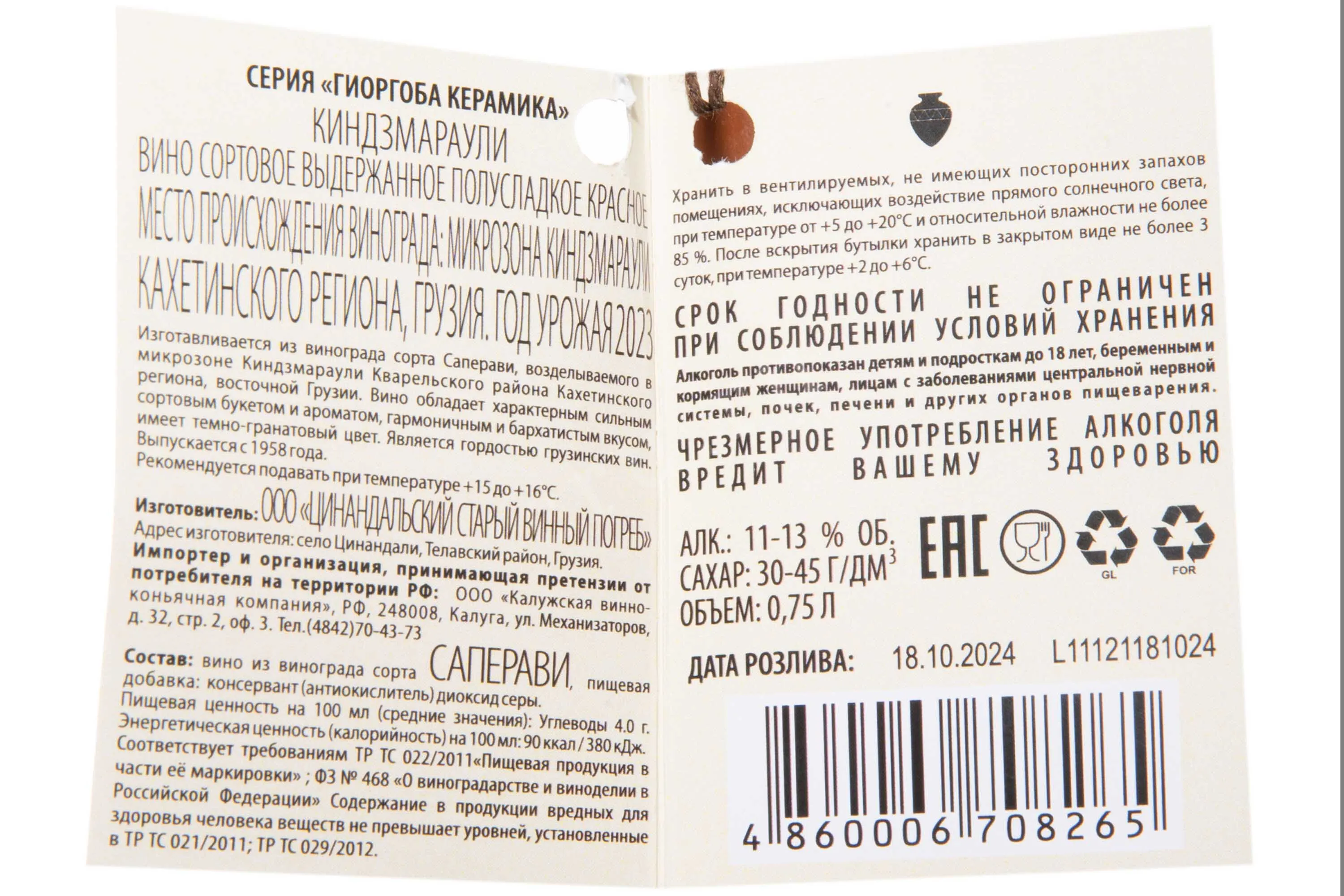 Вино Гиоргоба Киндзмараули в керамическом кувшине 0,75 л — это красное полусладкое спиртное от винной компании ООО «ЦСВП» под брендом «Гиоргоба», воплотившее дух грузинского виноделия. Напиток был создан из автохтонного сорта Саперави, собранного вручную в микрозоне Киндзмараули, где виноградники раскинулись у подножия Кавказских гор, в долине реки Дуруджи. Уникальный терруар региона — плодородные аллювиальные почвы, мягкий климат с тёплыми днями и прохладными ночами — придал ягодам высокую сахаристость и насыщенность вкуса. Урожай собирали до поздней осени, когда ягоды уже касались морозного воздуха, что усиливало их ароматическую сложность. После бережного брожения и естественной остановки ферментации напиток приобрёл природную cладость и бархатистую структуру. Вино было разлито в керамический кувшин — дань древним традициям хранения алкоголя в Грузии, подчёркивающую его аутентичность и статус подарочного напитка.