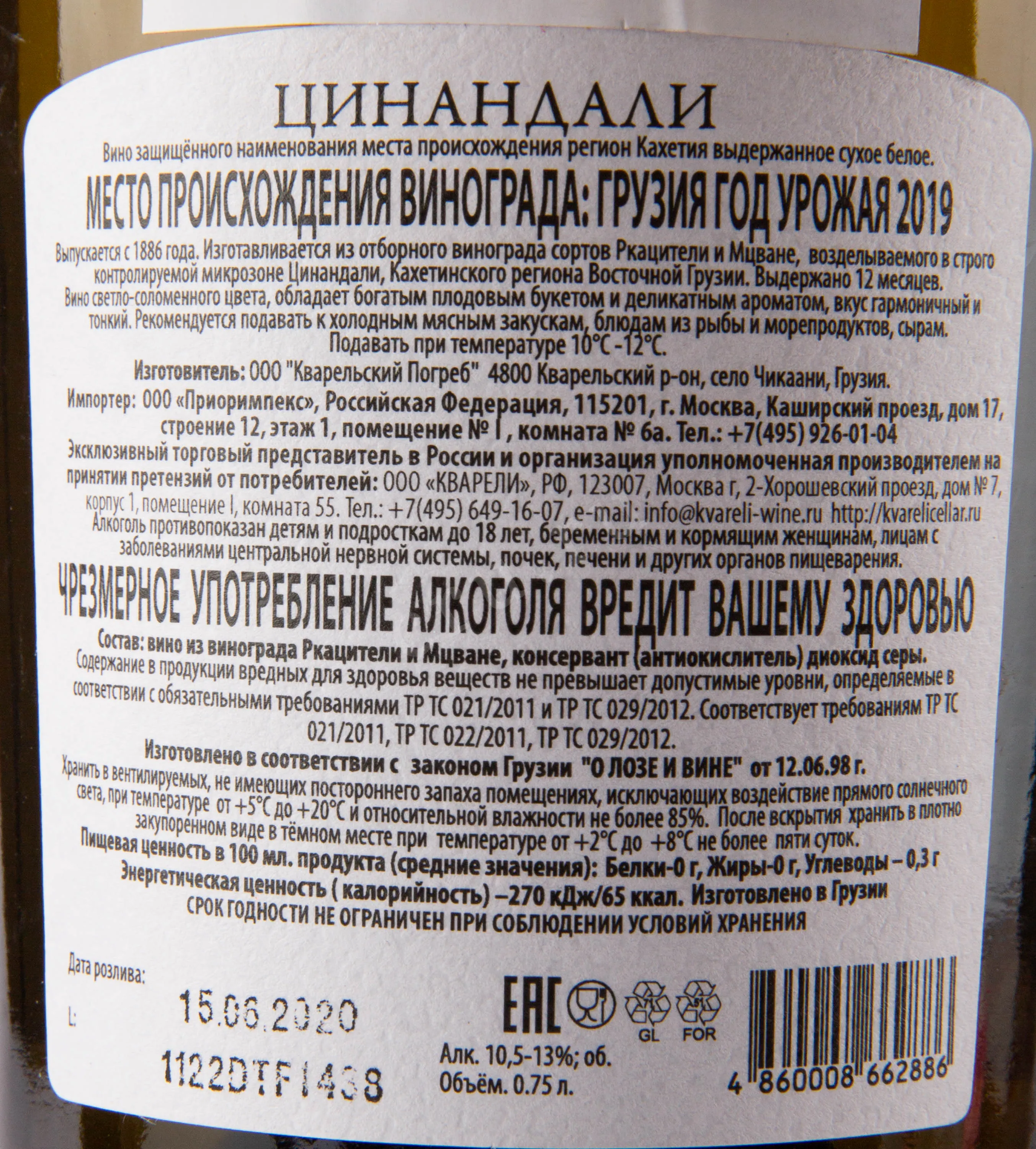 Вино Кварельский Погреб Цинандали в подарочной упаковке 0,75 л создавалось в сердце Кахетии, где издревле сохранялись традиции виноделия. Купаж автохтонных сортов Ркацители и Мцване проходил процесс винификации по классической технологии с последующей выдержкой не менее 12 месяцев в дубовой бочке, что придавало напитку глубину и утончённый характер. Микрозона Цинандали, получившая статус ЗГУ, славилась гармонией климата и почв, где тёплое солнце, горные ветра и богатые минералами земли обеспечивали винограду уникальный терруар. Здесь урожай собирался вручную, что позволило сохранить первозданную свежесть и богатство аромата, а сбалансированное сочетание сортов дарило элегантный вкус и долгий выразительный финал.
