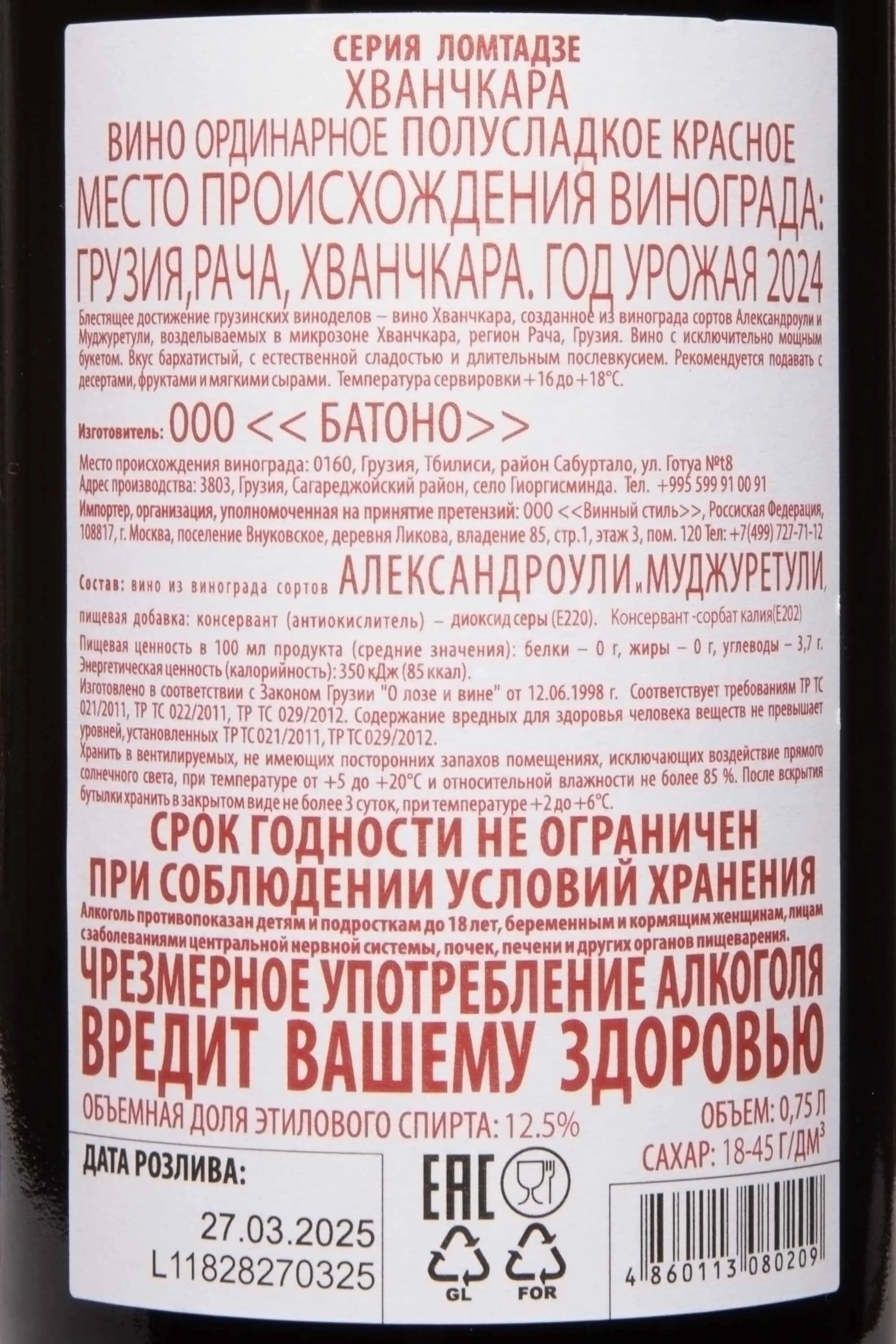 Красное полусладкое вино Lomtadze Khvanchkara 2021 г. 0,75 л — популярный грузинский алкоголь, изготовленный из автохтонных сортов винограда, который вырастили в микрозоне села Хванчкара и собрали на протяжении ограниченного года урожая. Сырье прошло процессы гребнеотделения, прессования и контролируемой ферментации в стальных цистернах, где постоянно поддерживалась температура в диапазоне 18-22 °C. Сбраживание прекратили путем охлаждения по достижении вином сахаристости 40 г/дм³.