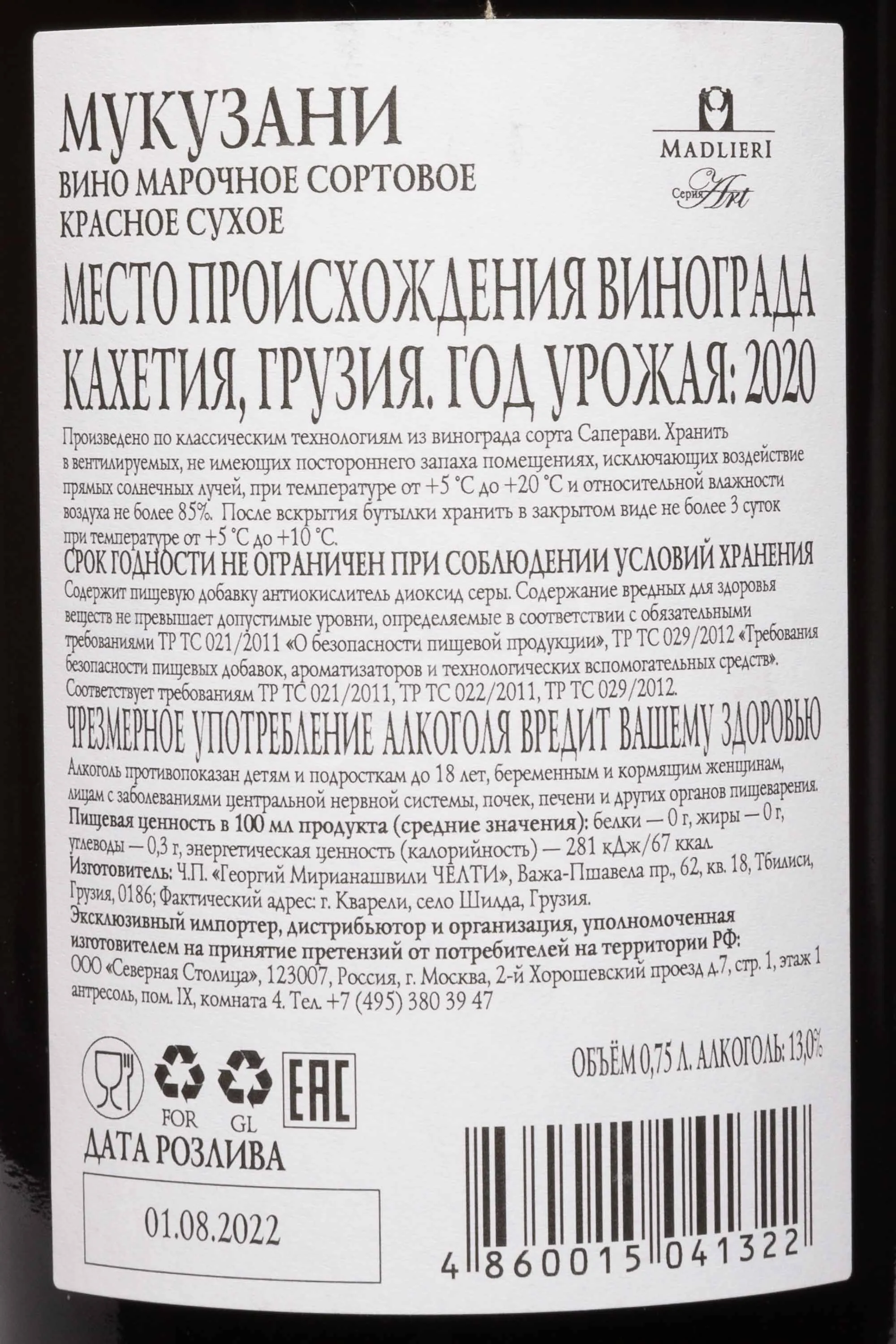 Вино Мадлиери Арт Мукузани 0,75 л производилось винной компанией ООО «Челти» под руководством собственника Г. Мирианашвили и относился к категории выдержанных красных напитков премиального уровня. Его создавали из благородного сорта Саперави, собранного в уникальной микрозоне Мукузани, где солнечные склоны, умеренный климат и богатые минералами почвы придавали урожаю особую концентрацию и насыщенность. Технология включала выдержку в дубовых бочках, благодаря чему напиток приобретал гармоничную структуру и выразительный характер. Местный терруар обеспечивал плотность и глубину вкуса, а традиции грузинского виноделия в сочетании с современными методами позволяли добиться редкого баланса силы и утонченности.