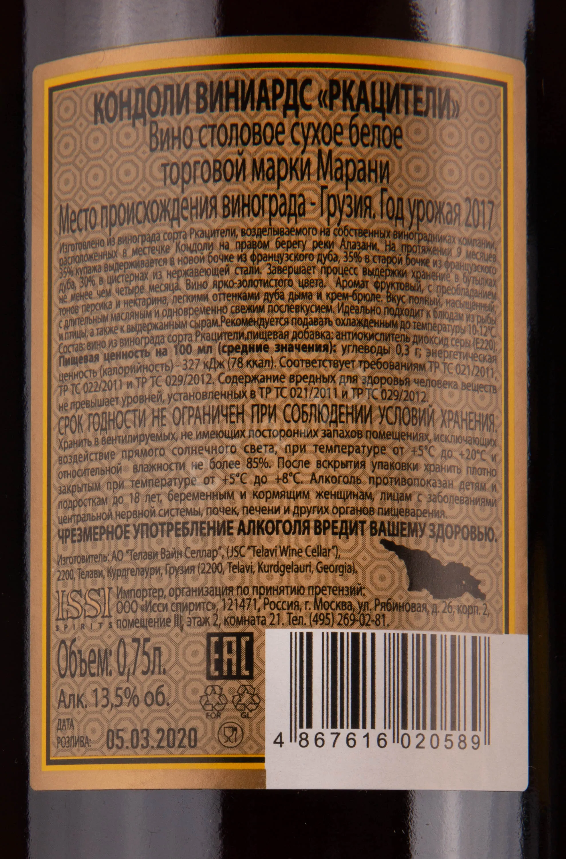 Вино Ркацители Марани Кондоли 0,75 л отличалось сложной технологией производства и уникальным характером, сформированным терруаром Кахетии. Напиток создавался в винодельне Marani из урожая виноградников Кондоли, расположенных на солнечных склонах Алазанской долины. Гроздья сорта Ркацители собирались вручную и подвергались тщательной селекции. Особенностью выдержки стало разделение на три части: 30% напитка находилось в старых французских бочках, ещё 30% — в новых бочках из лимузенского дуба, а оставшиеся 40% ферментировались и выдерживались на мезге в стальных чанах. Благодаря такому подходу напиток приобрёл светло-янтарный цвет, богатую текстуру и гармоничное сочетание свежести и глубины вкуса.