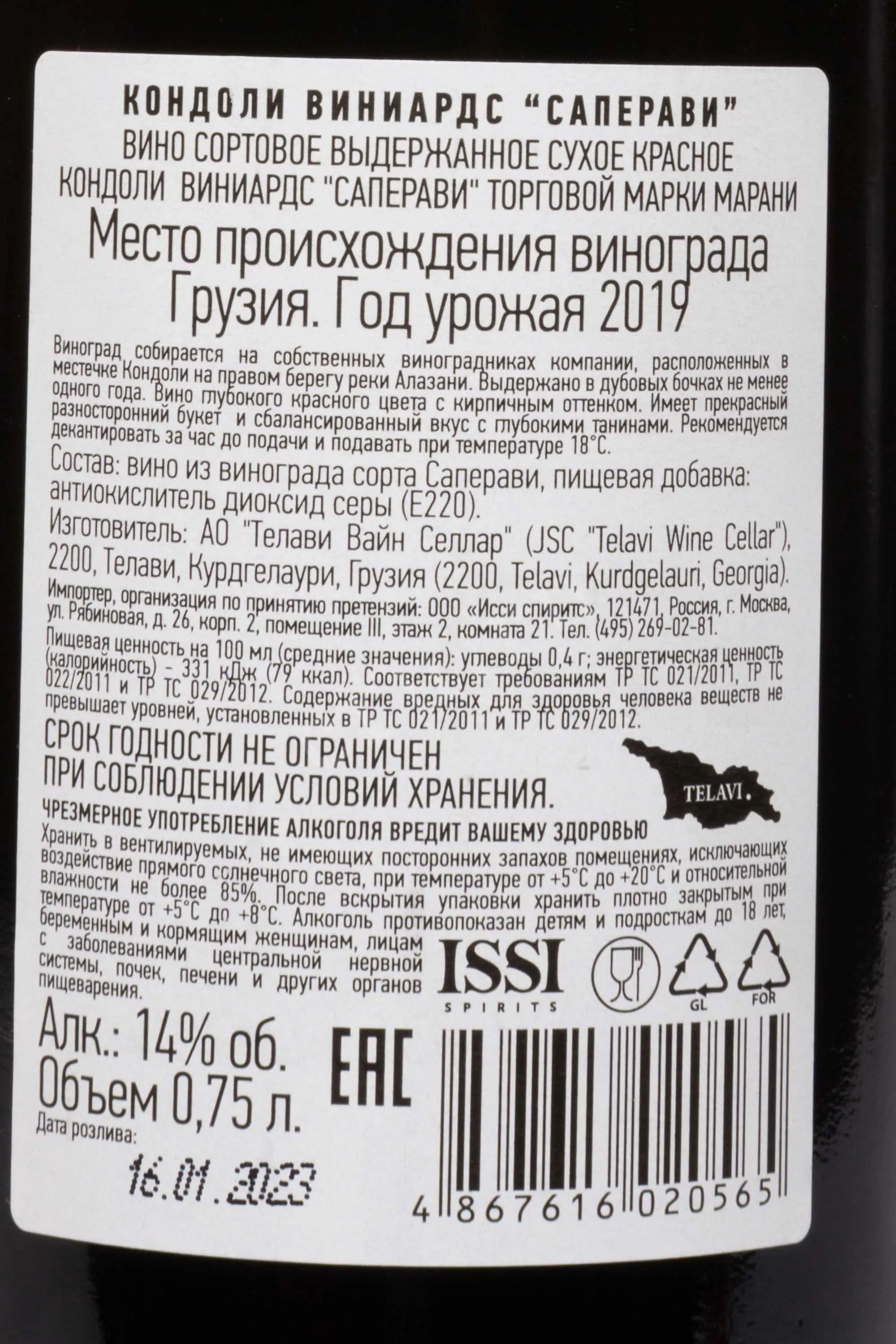 Вино Марани Кондоли Саперави 0,75 л происходило из престижного винодельческого региона Кахетия, где традиции производства передавались из поколения в поколение. Напиток создавался винодельческим хозяйством «Телави Вайн Селларс», известным своим вниманием к автохтонным сортам и строгим контролем качества. Для производства использовался виноград Саперави, собранный на историческом винограднике Кондоли, где уникальный терруар сочетал плодородные почвы и оптимальный микроклимат. После ферментации напиток выдерживался не менее 12 месяцев в дубовых бочках, что придавало ему сложность, глубину и гармоничное раскрытие ароматов. Благодаря этому процессу напиток отличился насыщенным пурпурно-рубиновым оттенком и богатым букетом.