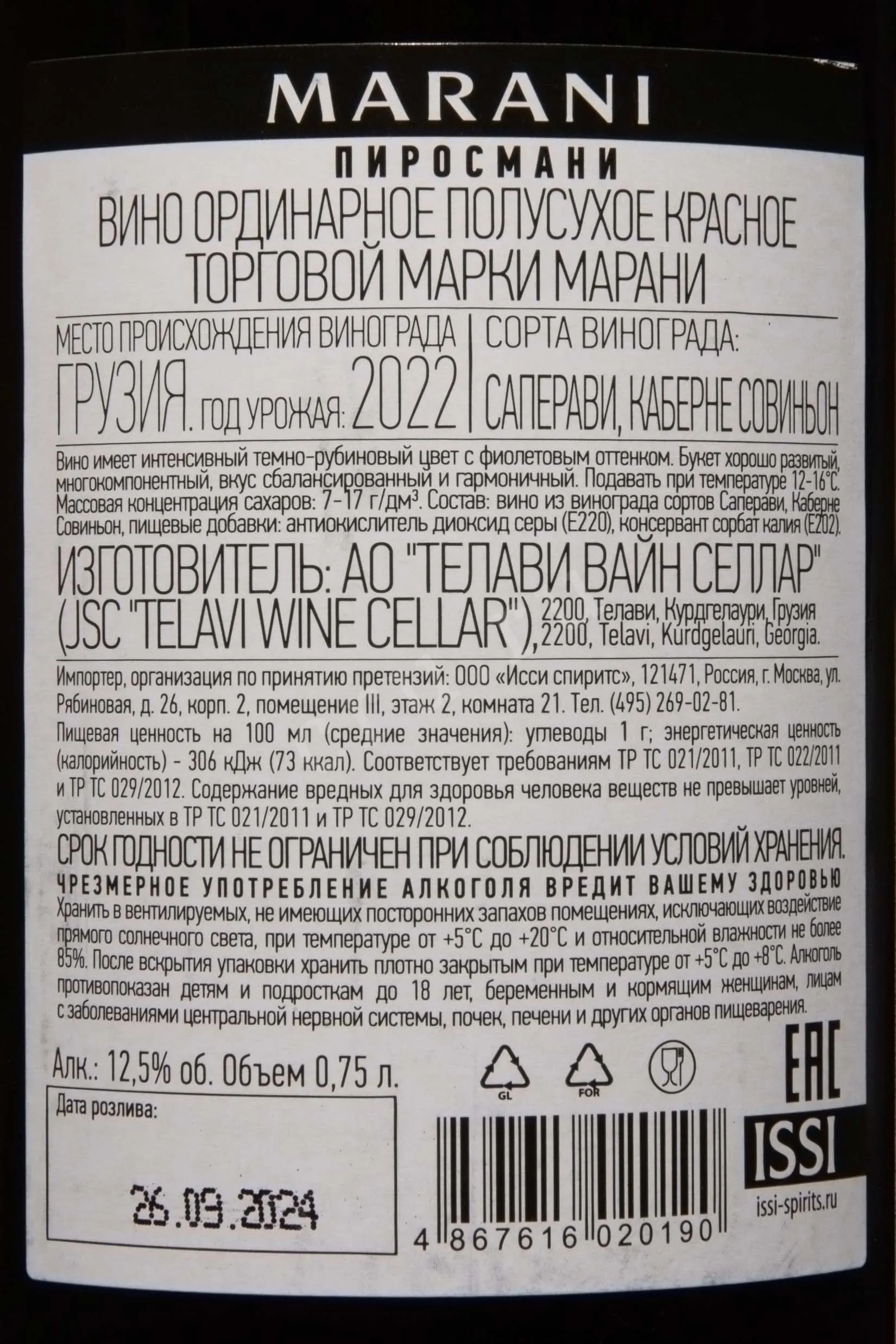 Красное полусухое вино Marani Pirosmani 2022 года 0,75 л создано в классическом грузинском стиле с акцентом на свежесть и гармонию вкуса. Виноград выращен в Алазанской долине, где мягкий климат и перепады температур между днем и ночью позволяют ягодам накапливать оптимальный баланс сахаров и кислотности. В 2022 году тёплое лето и сухая осень помогли сохранить высокое качество ягод. Ферментация проходила в стальных емкостях при контролируемой температуре, что обеспечило вину чистый профиль и выразительные ароматы. Выдержка была недолгой, что позволило сохранить натуральную фруктовость и мягкие танины. Уникальность этого вина заключается в его универсальности: оно подойдет как для обычного обеда или ужина, так и для праздничного стола или подарка.