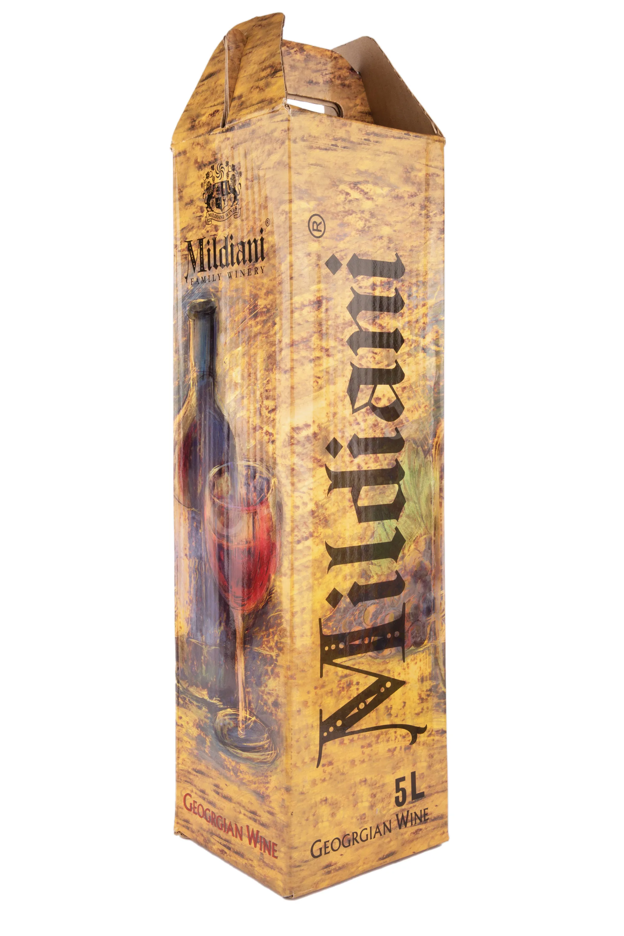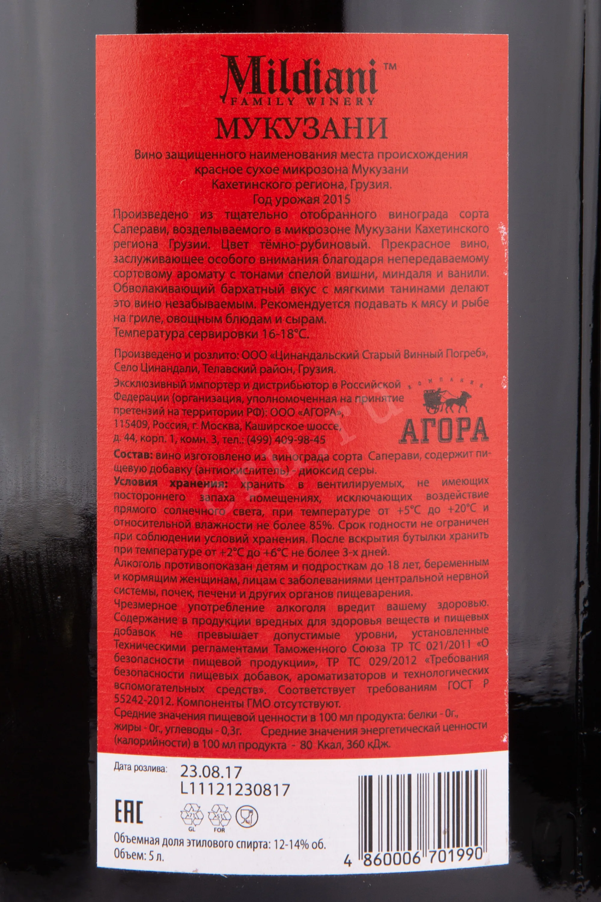 Вино Мукузани Милдиани 5,0 л — это выдержанный напиток, создаваемый семейной винной компанией «Милдиани», которая расположена в сердце Кахетии, регионе с древними винодельческими традициями. Для производства используют урожай автохтонного сорта Саперави, собранного в микрозоне Мукузани, относящейся к ЗГУ. Здесь мягкий климат с тёплым солнцем и перепадом дневных и ночных температур, а также глинисто-известковые почвы, что позволяет ягодам накапливать оптимальное количество сахара и кислотности. Технология включает выдержку не менее 18 месяцев, благодаря чему напиток приобретает насыщенный характер и гармоничный букет. Красное сухое вино разливается в стеклянную тару объёмом 5,0 литров, что подчёркивает его ценность и делает подходящим для больших застолий.