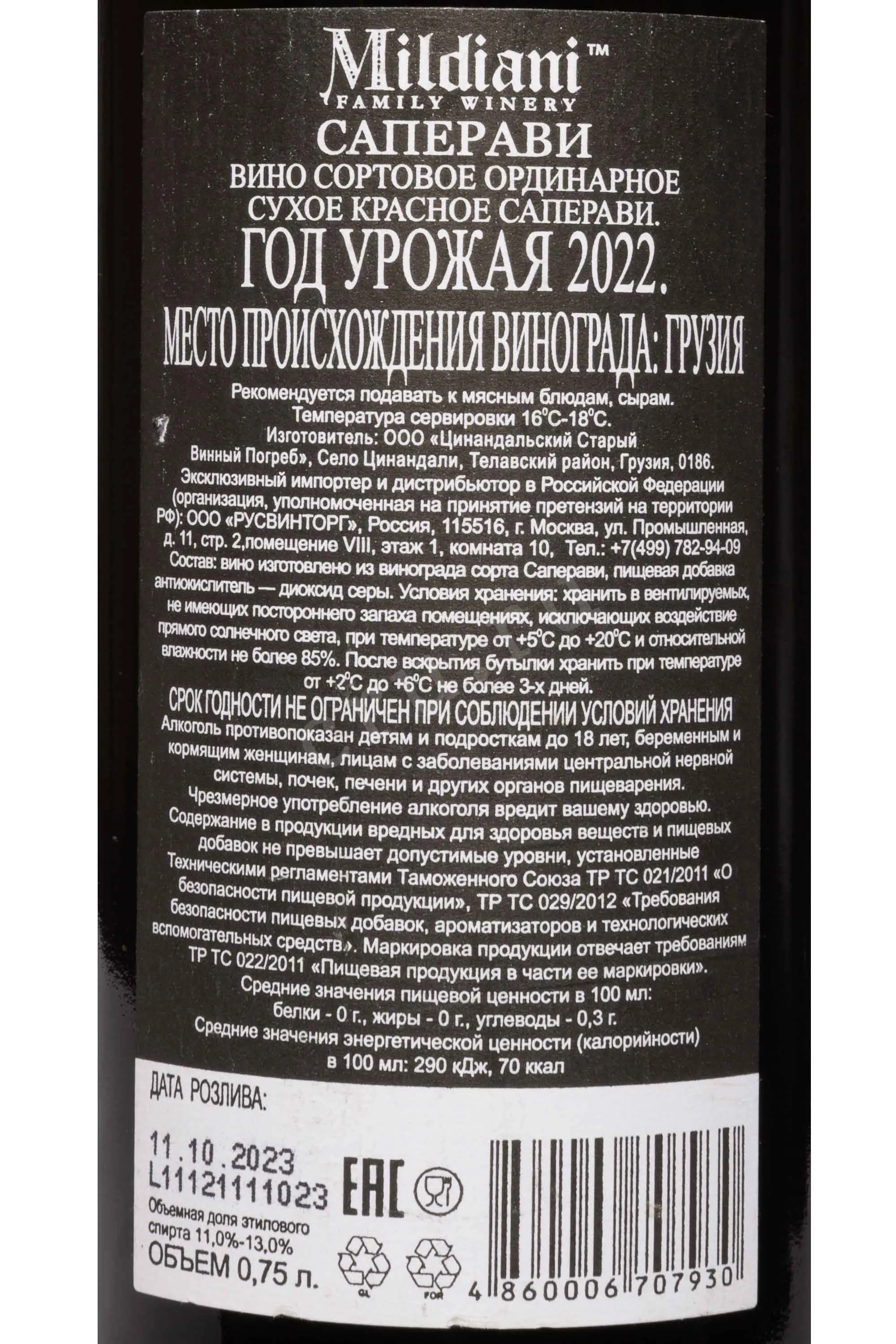 Mildiani Saperavi 2022 0,75 л производится компанией ООО "Цинандальский Старый Винный Погреб", расположенной в селе Цинандали Телавского района региона Кахетия. В основе этого красного сухого вина - знаменитый грузинский автохтонный сорт Саперави. Урожай тщательно отбирается вручную, а затем отправляется на винодельню, где проходит полный цикл винификации в стальных ферментаторах при строго контролируемой температуре. Такой подход обеспечивает сохранение и раскрытие естественных сортовых особенностей ягод, подчёркивая их насыщенный аромат и глубокий вкус.