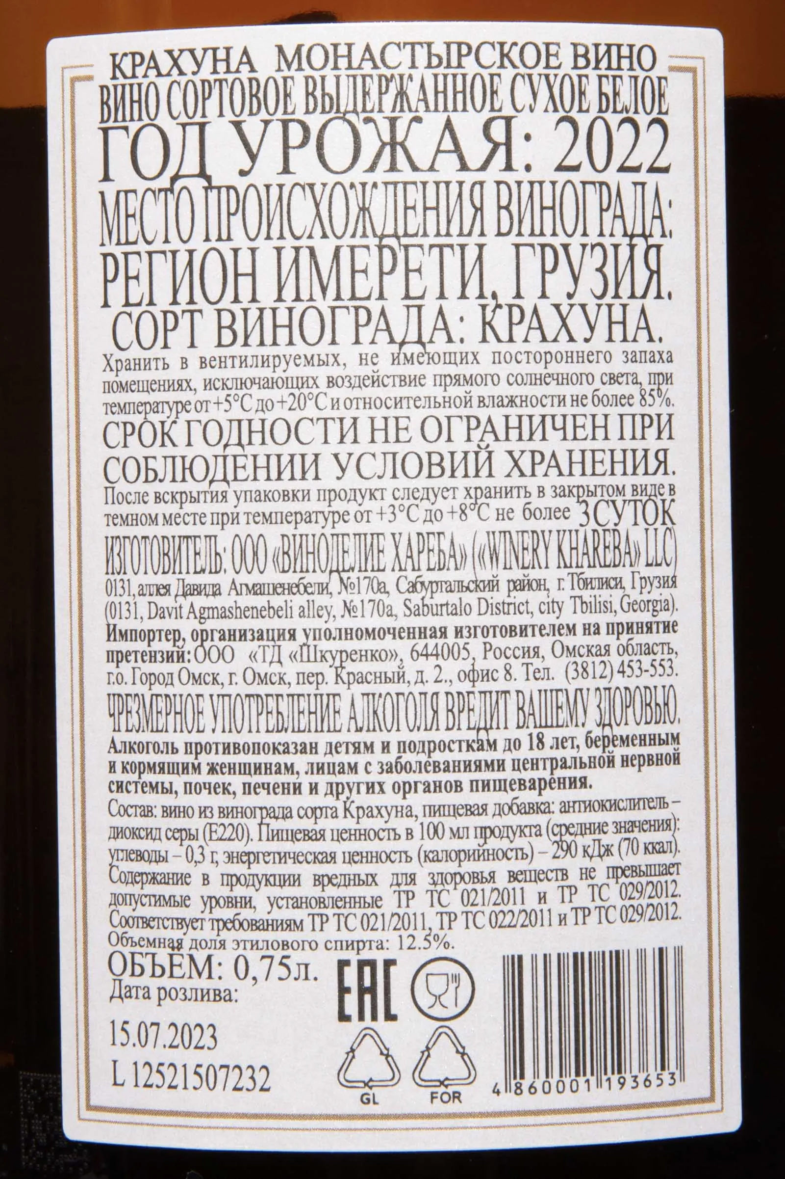 Белое сухое Монастырское Вино Крахуна 2022 года — это изысканный напиток из серии Monastery Qvevri Wine, созданный ООО «Виноделие Хареба». Вино произведено по традиционной кахетинской технологии в квеври — больших глиняных амфорах, зарытых в землю, что позволяет сохранить природную чистоту вкуса и аромата. Виноград сорта Крахуна выращен на солнечных склонах Имерети, где особый микроклимат и почвы способствуют раскрытию его уникальных характеристик. Это вино идеально подходит для неспешного наслаждения в компании друзей и в моменты уединения, лучше всего раскрывается в первые 2-3 года после урожая.