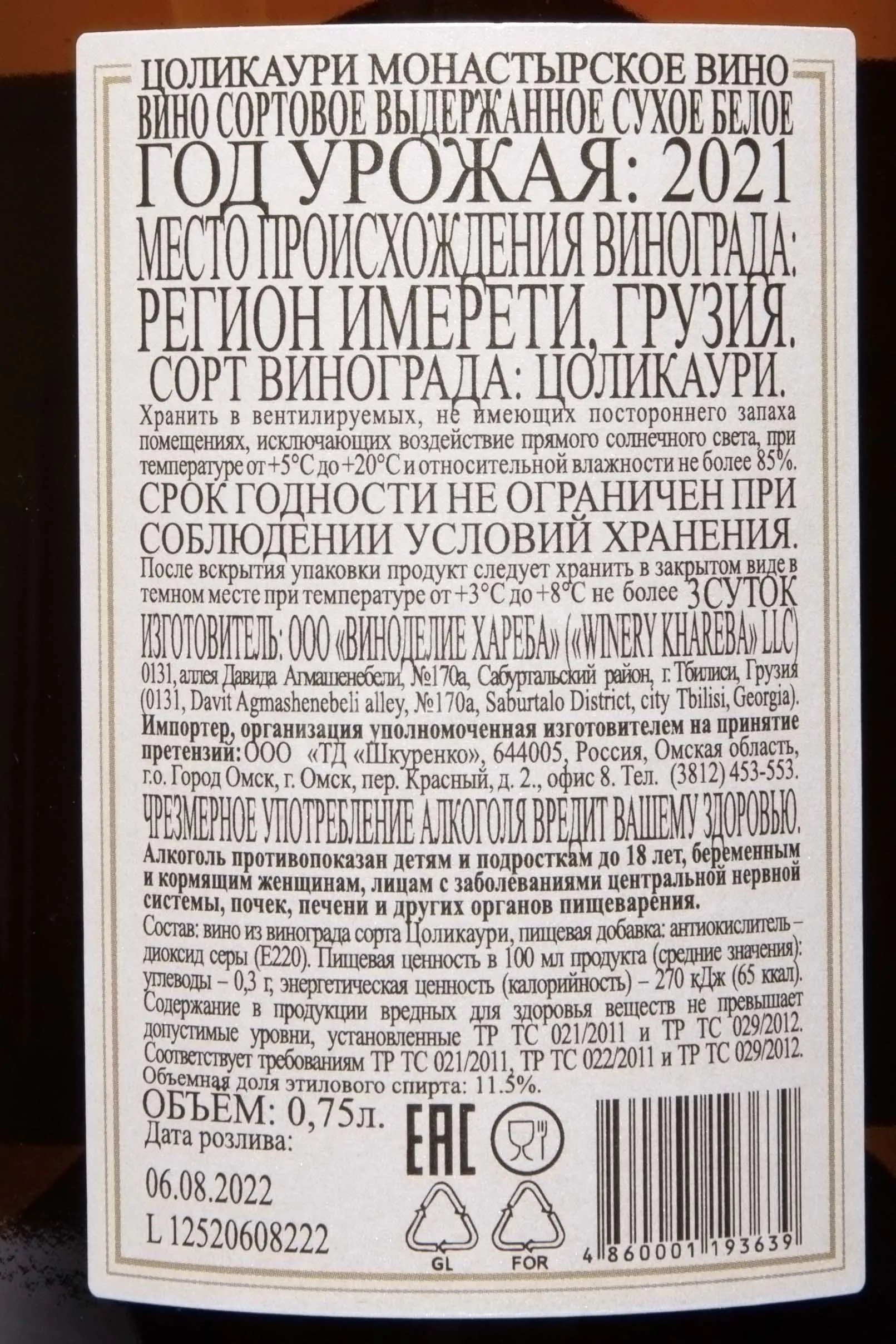Монастырское вино Цоликаури из серии Monastery Qvevri Wine от ООО «Виноделие Хареба» — это белое сухое вино, созданное с уважением к древним традициям грузинского виноделия. Производится в регионе Имерети, где на склонах с мягким климатом и плодородной почвой зреет сорт Цоликаури. Вино выдерживается в квеври — глиняных сосудах, закопанных в землю, что придаёт напитку особую структуру и характер. Это вино — результат сочетания природы, истории и мастерства виноделов. Оно отлично подойдёт для дружеских встреч, лёгких ужинов и медитативных моментов. Лучше всего наслаждаться им в течение трёх лет после урожая.