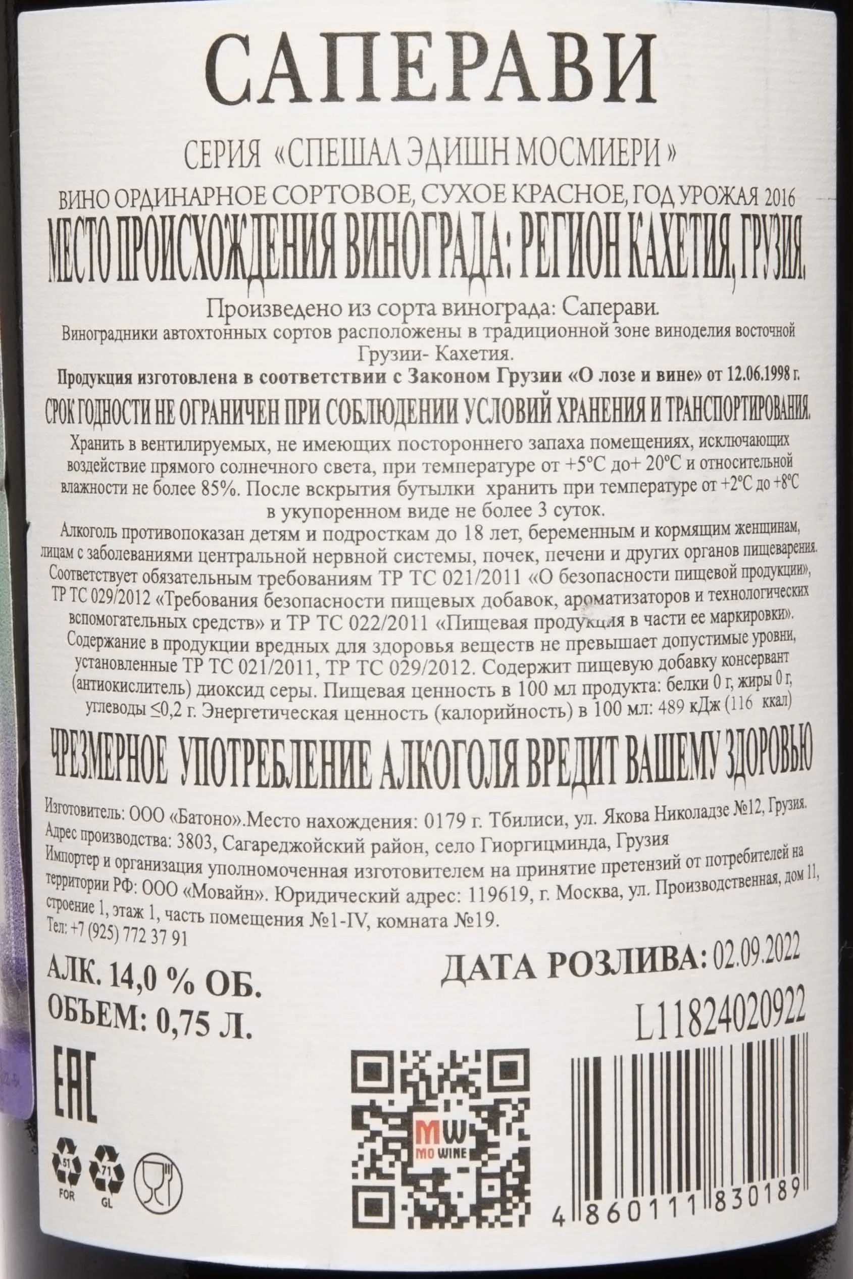Вино Мосмиери Саперави Спешл Эдишн 0,75 л — редкий образец грузинского винодельческого мастерства, воплощающий дух старинных традиций и характер терруара Кахетии. Этот напиток создан компанией «Батоно» в лимитированной серии, из автохтонного сорта Саперави, выращенного на старых лозах в окрестностях деревни Мосмиери, где виноградники питаются минералами глинисто-известковых почв и прохладными бризами с Алазанской долины. Производство сочетает классические методы брожения в кверви — глиняных амфорах, зарытых в землю, — и современный контроль температуры, что позволяет сохранить естественную силу и глубину аромата. Благодаря выдержке и строгому отбору ягод, напиток обретает выразительную структуру, сбалансированность и благородный характер, достойный коллекционных вин.