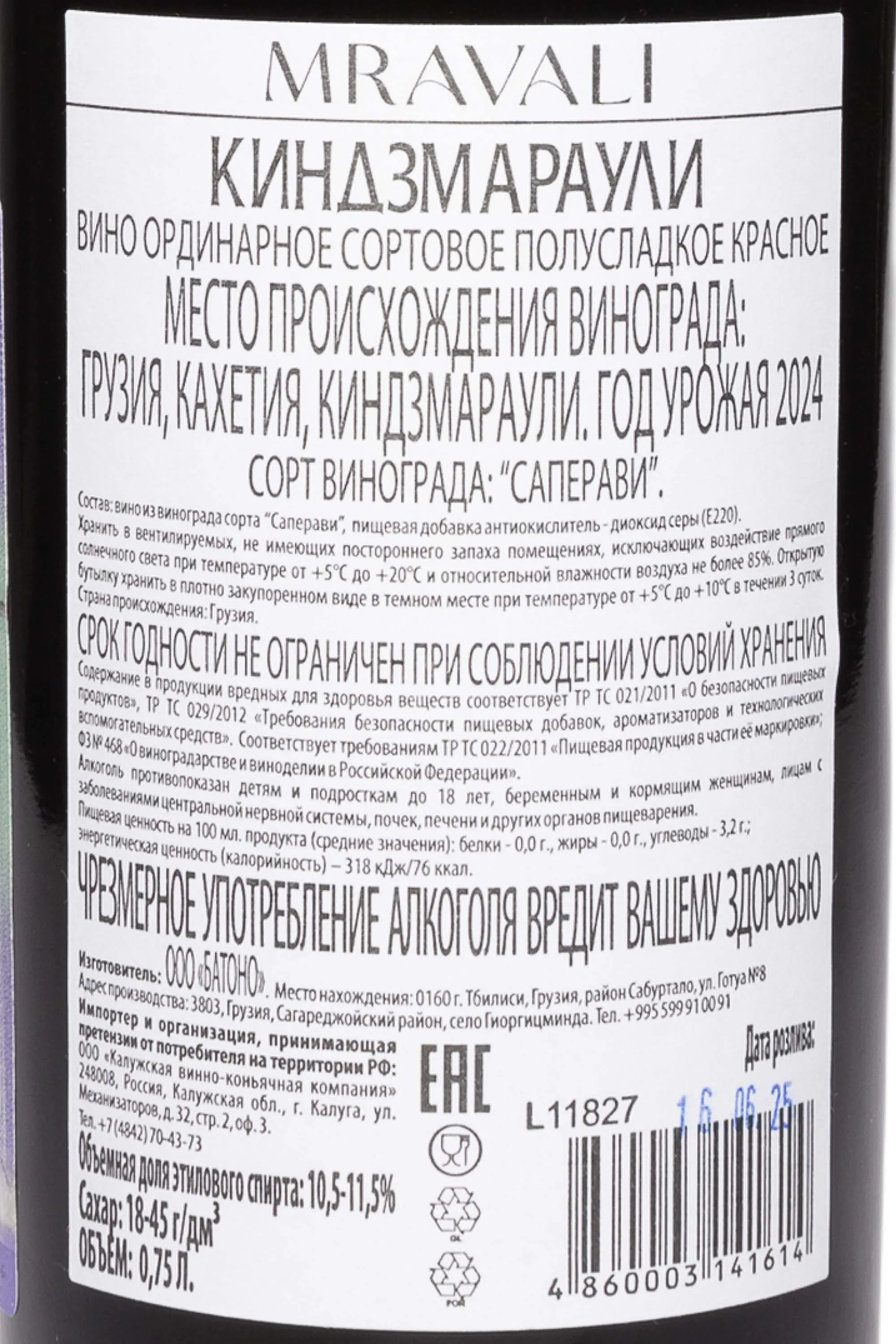 Красное полусладкое вино Mravali Kindzmarauli 2024 года 0,75 л создано в традиционном грузинском стиле, в долине Кахетии, у подножия Кавказских гор. Виноградники расположены в микрозоне Киндзмараули, где почвы богаты минералами, а климат сочетает жаркие дни и прохладные ночи. 2024 год отличился стабильной погодой — весна была мягкой, а лето сухим, что обеспечило равномерное созревание ягод. Виноград собирают вручную и ферментируют при контролируемой температуре, чтобы сохранить естественную сладость и свежесть сорта. После короткой выдержки в нейтральных резервуарах вино приобретает гармонию между фруктовостью и мягкими танинами. Мравали Киндзмараули ценят за чистоту вкуса и баланс, а его качество отмечают винные эксперты как пример современного подхода к классическому грузинскому стилю.