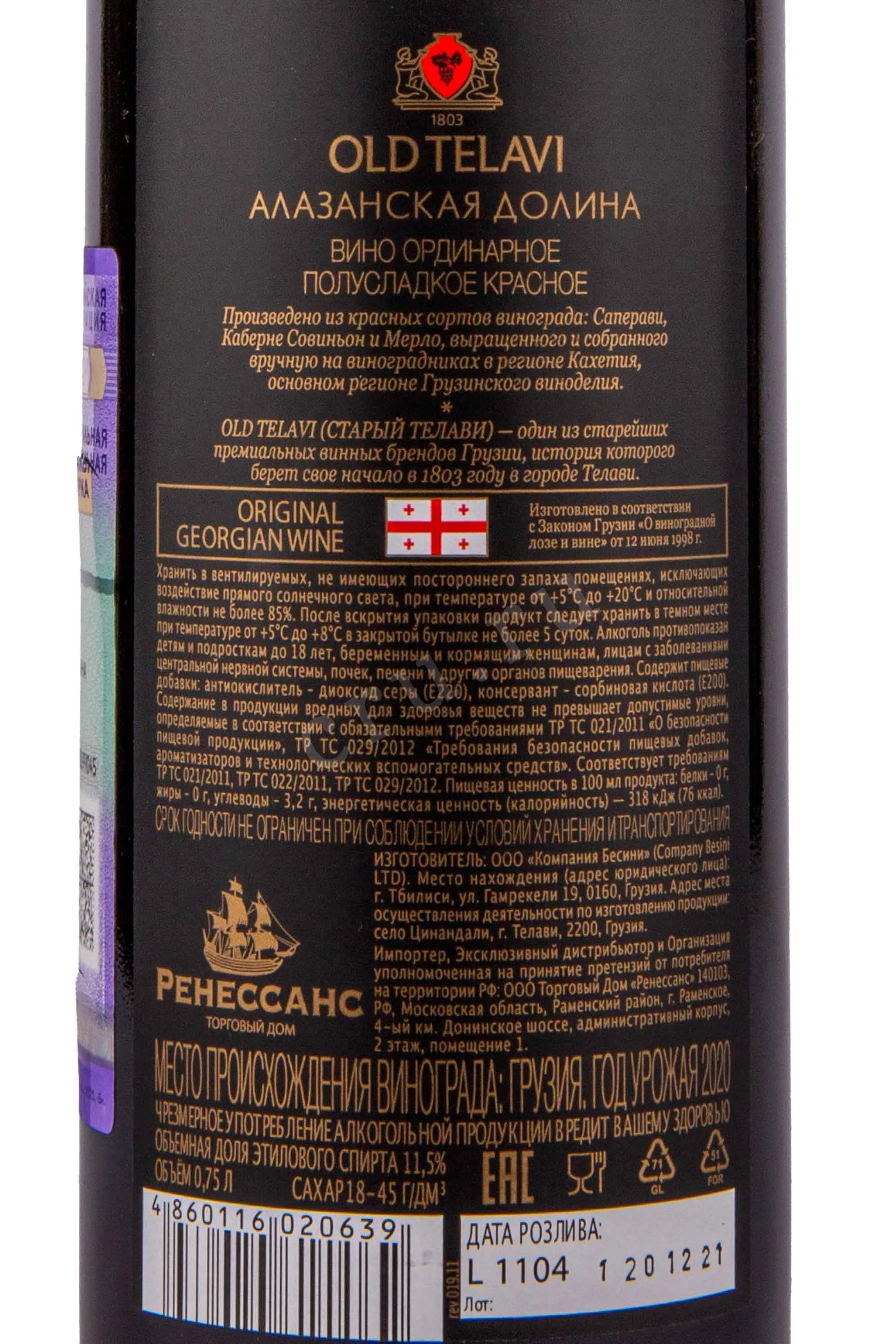 Вино Олд Телави Алазанская Долина красное полусладкое 0,75 л создано в сердце Кахетии — регионе, где виноделие веками определяло ритм жизни. Напиток родился из винограда, выращенного в долине реки Алазани, где мягкий климат, насыщенные минералами аллювиальные почвы и солнечные склоны создавали идеальные условия для формирования глубокого вкуса и аромата. Производство осуществлялось по стандартам ЗГУ «Алазанская Долина»: ягоды сортов Саперави, Каберне Совиньон и Мерло подвергались бережному прессованию, а ферментация проходила при контролируемой температуре, что позволило сохранить естественную сладость и фруктовый характер. После выдержки напиток приобрёл бархатистую текстуру и гармоничное послевкусие, вобрав в себя теплоту грузинской земли и мастерство виноделов «Олд Телави».