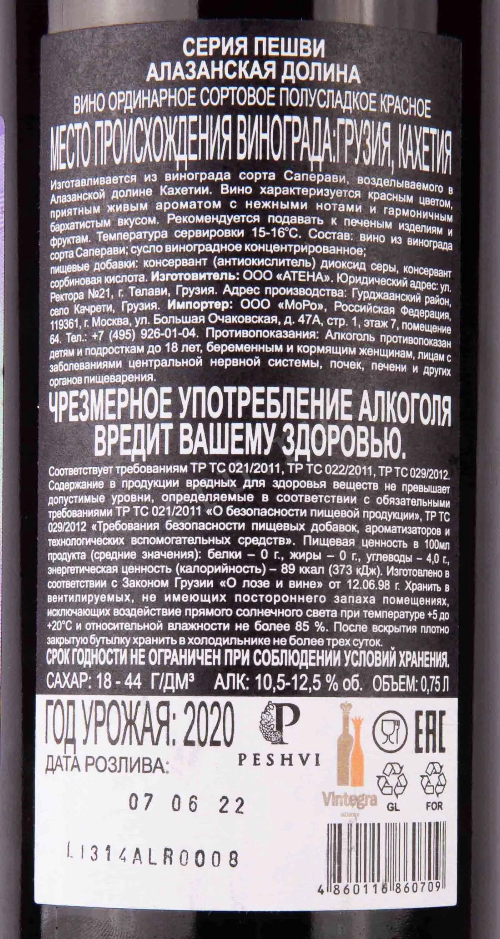 Красное полусладкое вино Peshvi Alazani Valley Red 2020 года 0,75 л — легкое и мягкое, в типичном кахетинском стиле. Виноград был выращен в долине реки Алазани, где тёплый климат и плодородные аллювиальные почвы способствуют накоплению сахара и сохранению свежести. 2020 год был удачным для виноделов, потому что погода не преподнесла никаких неприятных сюрпризов. Весной чередовались солнечные и дождливые дни, но в целом было тепло. Лето было жарким, как обычно, осень — сухой, комфортной. Урожай винограда собрали вовремя. Ферментация проходила в стальных емкостях при контролируемой температуре, с последующей кратковременной выдержкой. Это помогло сохранить натуральную сладость вина и фруктовые ноты во вкусе.
