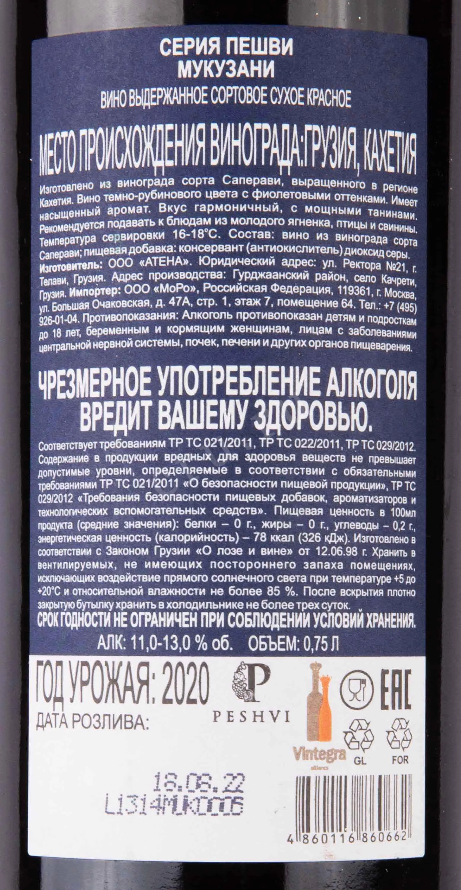 Вино Пешви Мукузани 0,75 л — благородный напиток, созданный в сердце грузинского виноделия, регионе Кахети. Этот выразительный алкоголь от ООО «Катена» воплощает дух древней традиции, соединённый с современными технологиями. Производится по строгим стандартам ГОСТ виноделия Грузии, из автохтонного сорта винограда Саперави, собранного в микроклиматической зоне Мукузани — одном из самых уважаемых терруаров страны. Умеренно тёплый климат, перепады дневных и ночных температур и плодородные известково-глинистые почвы придают ягодам концентрированный вкус и насыщенный цвет. После традиционной винификации вино проходит дополнительную выдержку в дубовых бочках не менее 6–8 месяцев, что раскрывает его ароматическую глубину и формирует благородный характер.