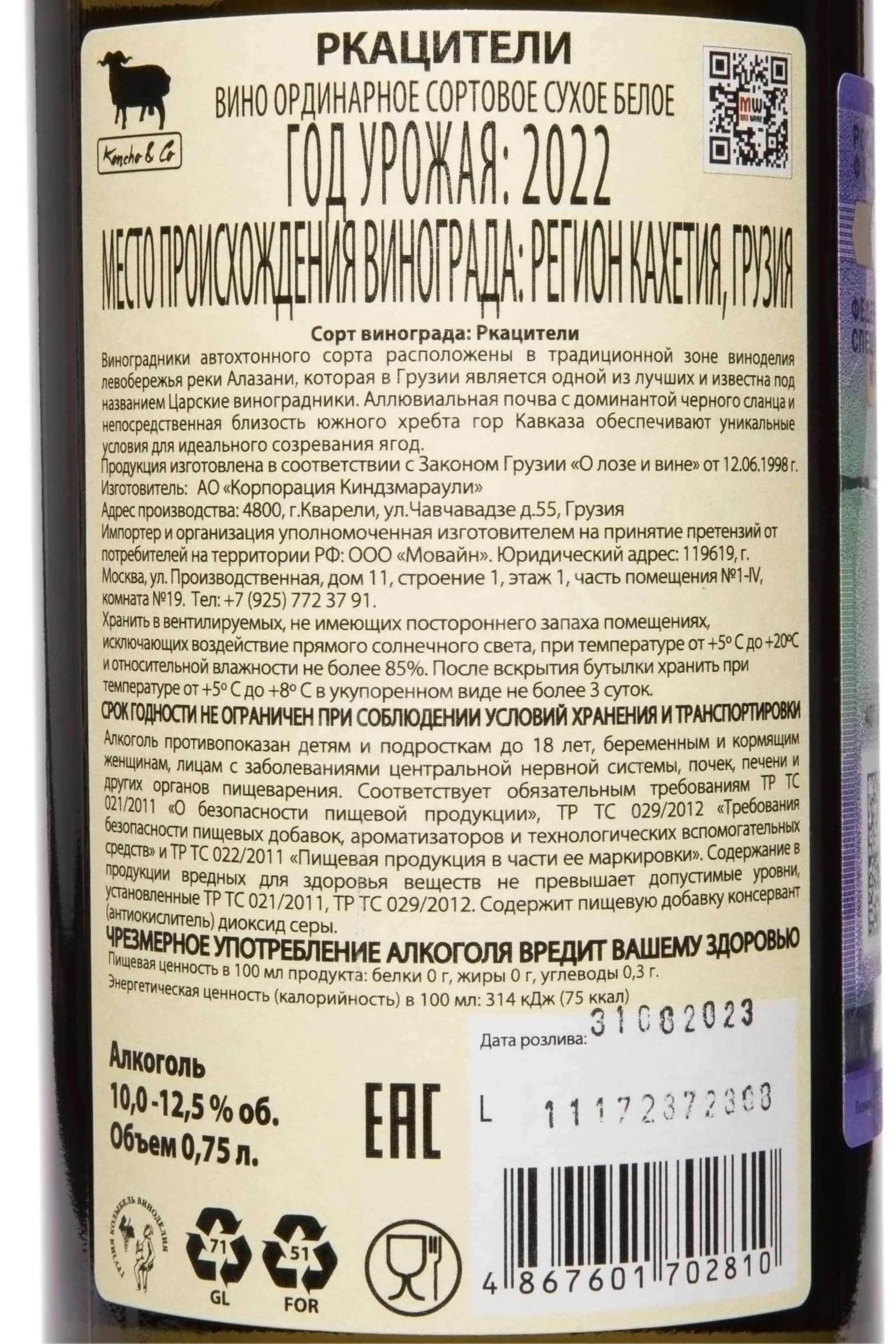 Koncho & Co Rkatsiteli 2022 г. 0,75 л — сортовое сухое белое вино, созданное из автохтонного винограда Ркацители, выращенного в традиционной винодельческой зоне Кахетии на левобережье реки Алазанис. Аллювиальные почвы с доминированием чёрного сланца и близость южного хребта Кавказа формируют идеальные условия для созревания ягод, придавая вину свежесть, структуру и характерную минеральность. Вино отличается чистым, гармоничным профилем, подчёркивающим природную выразительность сорта. Оно подходит как для лёгких гастрономических сочетаний, так и для употребления в качестве самостоятельного напитка.