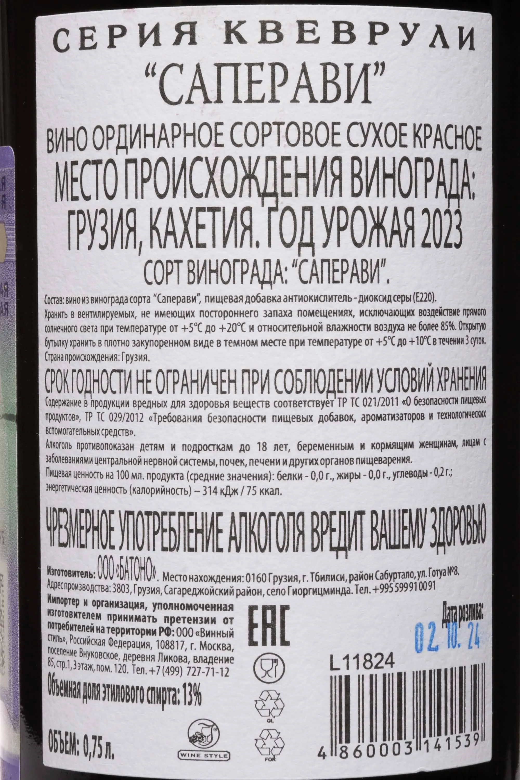 Вино Квеврули Саперави 0,75 л — насыщенный грузинский напиток с глубоким характером и выразительным темпераментом. Его создание основано на древней кахетинской традиции брожения и выдержки в глиняных амфорах квеври, зарытых в землю. Именно такая технология придаёт вину особую структуру, насыщенность и сложный ароматический букет. Виноград выращен на солнечных склонах Кахетии, где плодородные аллювиальные почвы и мягкий климат создают идеальные условия для сорта Саперави. Производитель ООО «Батоно» сочетает древние методы и современные технологии, добиваясь безупречного баланса между насыщенностью вкуса и благородной мягкостью. Каждый глоток раскрывает душу грузинской земли, её тепло и природную энергию, впитанные ягодами во время долгого вызревания под солнцем.