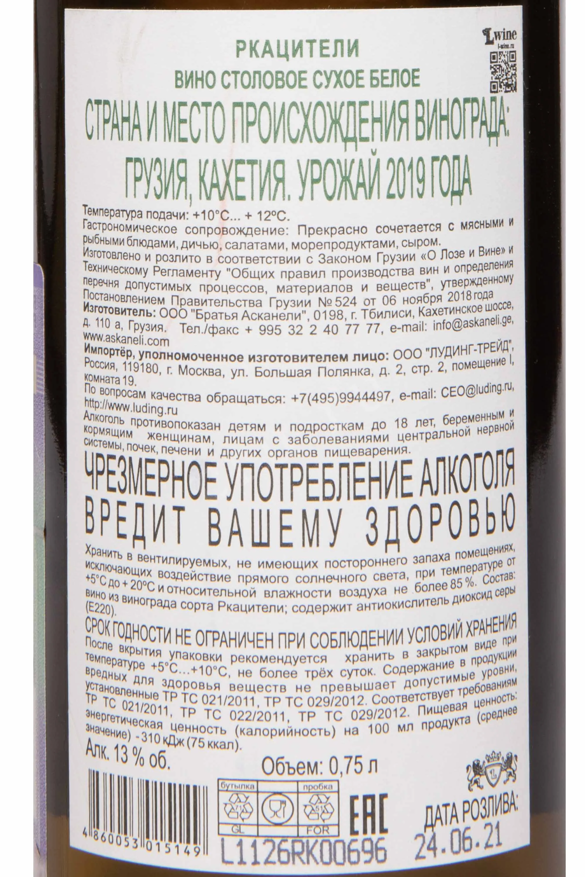 Белое сухое вино Rkatsiteli Askaneli Classic Collection 2019 г. относится к винтажному типу благодаря присутствию в составе исключительно ягод, собранных на протяжении одного урожайного года. Виноград аборигенной вариации с угодий Кахетии прошел обработку по классическому методу винификации без применения искусственных добавок.